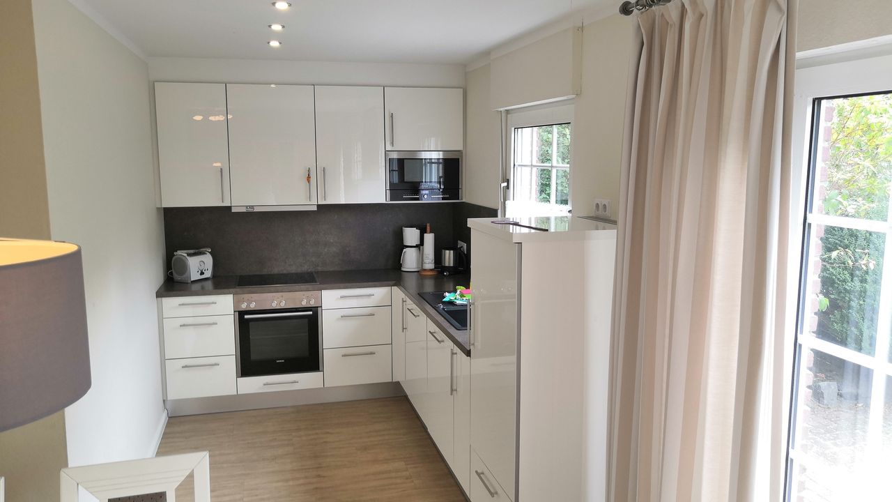 Die komplett eingerichtete Küche ist ausgestattet mit Geschirrspülmaschine, Backofen, Koch-Ceranfeld, Kühlschrank mit Gefrierfach, Mikrowelle, Wasserkocher und Kaffeemaschine.