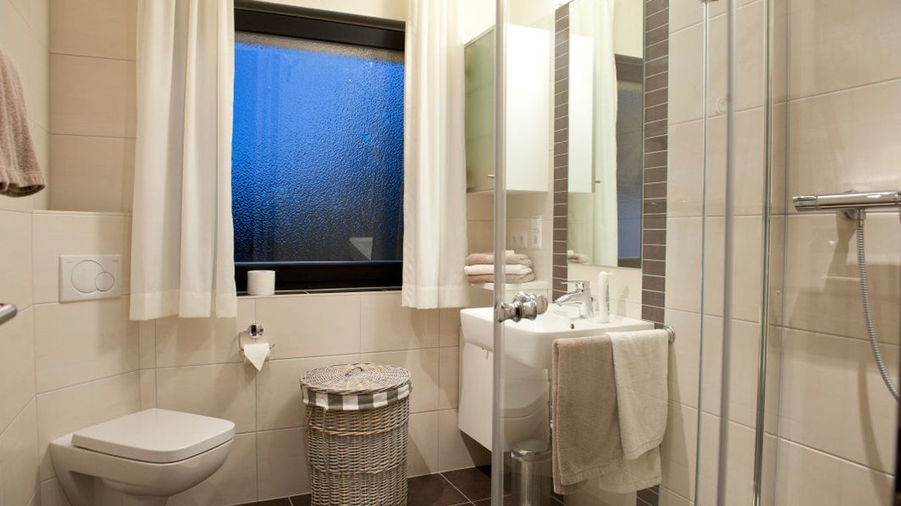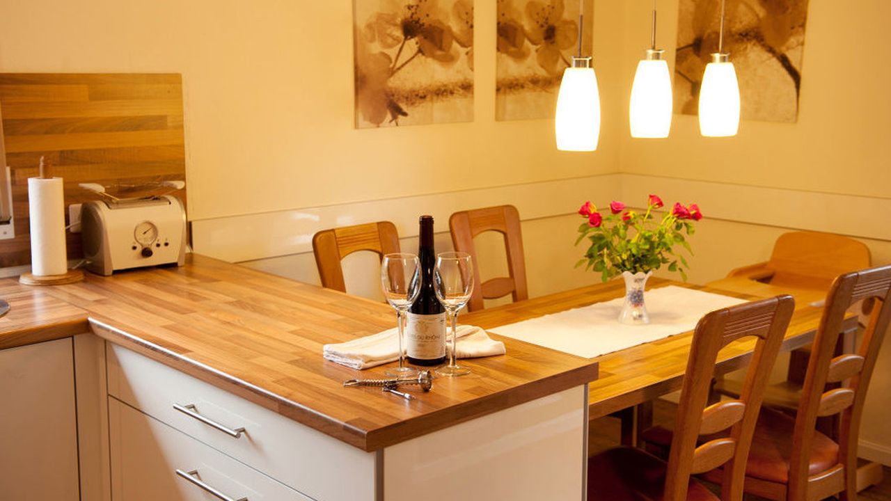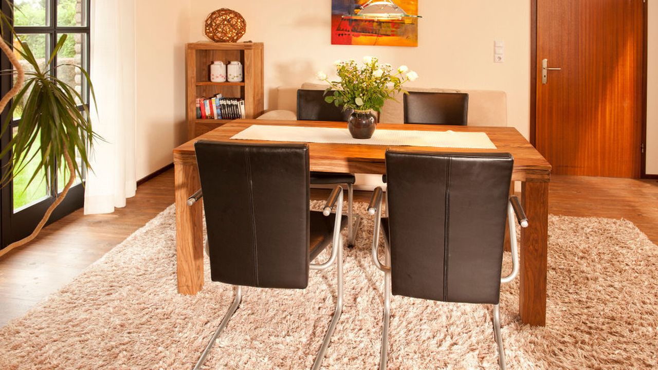 Ein großer Esstisch bietet Platz für bis zu sechs Personen und wird auch gerne für ausgiebige Spielnachmittage bei Regenwetter genutzt. Der Mittelpunkt dieser geräumigen Ferienwohnung ist das Wohnzimmer mit einer großen Couchgarnitur für bis zu sechs Personen und einem Flachbildfernseher. Durch eine Glastür gelangen Sie auf die Terrasse, die durch einen bepflanzten Wall herrlich geschützt ist. Mit einer Tasse Kaffee oder einem Glas Wein kann man es sich hier in den schönen Teakholzmöbeln gut gehen lassen. Zugang zur Terrasse haben Sie auch von der Küche. Hier bietet die von einem Tischler maßgefertigte Küche allen Komfort, den Sie für die Zubereitung von Mahlzeiten benötigen. Für das gemeinsame Kochen sind Ihnen Koch-Ceranfeld mit Backofen, Mikrowelle, Kühlschrank mit Gefrierfach, Kaffeemaschine, Wasserkocher und vieles mehr sicher sehr hilfreich. Selbstverständlich verfügt auch diese Küche über eine Spülmaschine. Das hochwertige Badezimmer ist mit einer ebenerdigen großen Dusche (Glastüren als Abtrennung), einem WC und einem Wachbecken ausgestattet. Die Fußbodenheizung sorgt für angenehme Wärme im Winter.