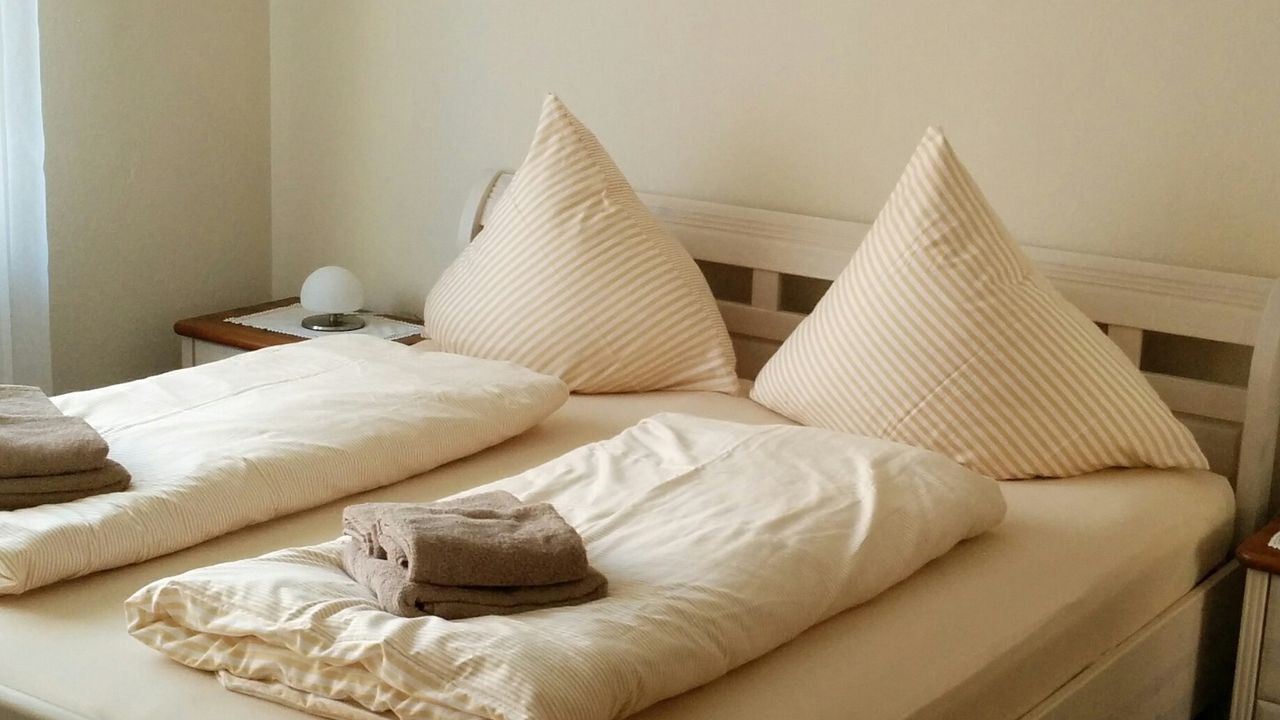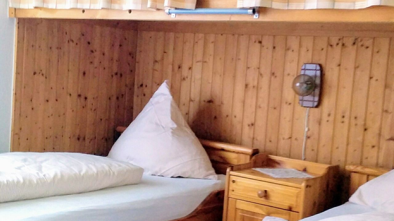 Die Ferienwohnung im Erdgeschoss ist 100 m² groß und bietet Platz für bis zu fünf Personen. Die Wohnung umfasst zwei Schlafzimmer - das eine mit Doppelbett, das andere mit zwei Einzelbetten und einem fest eingebautem Hochbett - ein besonderer Spaß für alle Kinder. Reisekinderbetten mit einer verstärkten Matratze stehen selbstverständlich zur Verfügung und werden gerne für Sie aufgebaut.