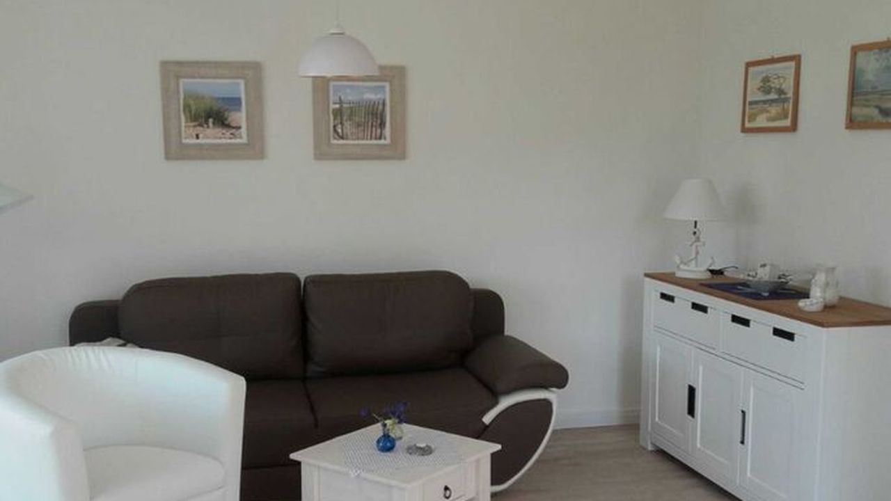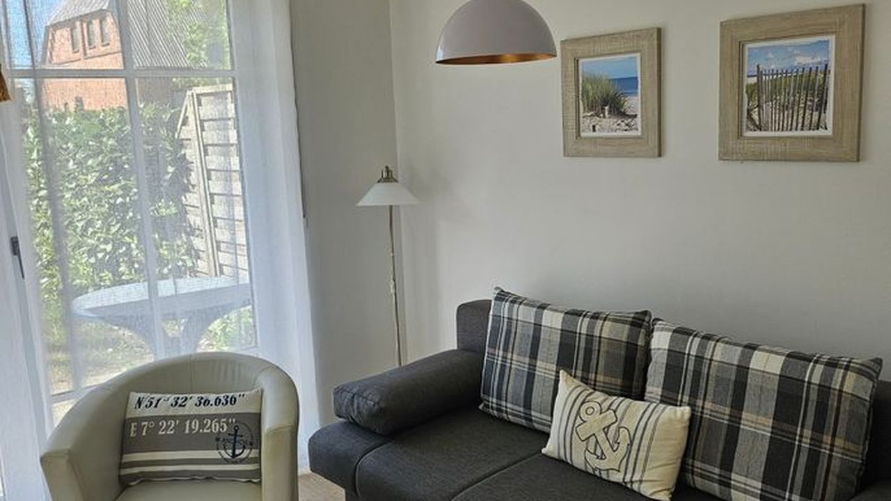 Das behagliche Wohnzimmer ist ausgestattet mit einem Flachbild-SAT-TV, Radio, einer komfortablen Couch sowie einem Sessel. Von hier aus gelangen Sie direkt auf die sonnige Südterrasse, die gemeinsam mit dem angrenzenden Garten zu entspannten Stunden im Freien einlädt. Natürlich stehen Ihnen Terrassenmöbel inklusive Tisch zur Verfügung.