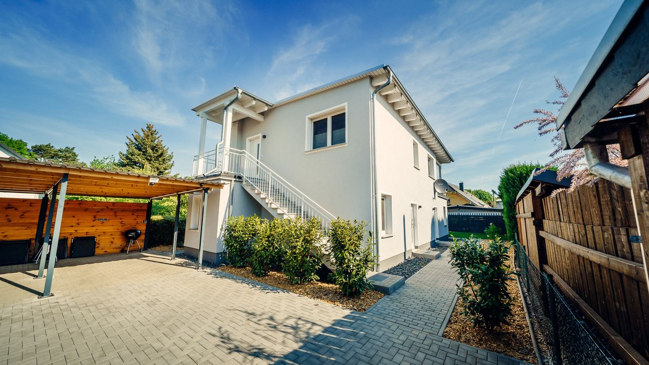 Das Lausitzer Edelquartier - 3 Wohneinheiten mit Terrassen - am Senftenberger See in Großkoschen - Natur trifft minimalistische Eleganz. Genießen Sie die Vorzüge, wie z.B. eine voll ausgestattete "Nolte"-Küche, Klimaanlage, Boxspringbetten, einen Parkplatz auf dem umzäunten Grundstück mit Gartennutzung und Strandnähe.Das Lausitzer Edelquartier heißt Urlaubs- und Ruhesuchende am Senftenberger See im Ortsteil Großkoschen der Stadt Senftenberg herzlich willkommen. Das Ferienhaus befindet sich in einer Sackgasse und ist nur wenige Gehminuten vom Ufer des Sees entfernt.