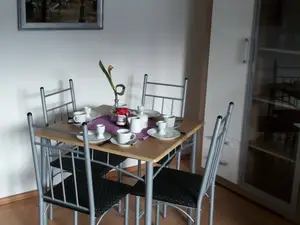 Der Eßbereich im Wohnzimmer ist gemütlich und mit allem ausgestattet.