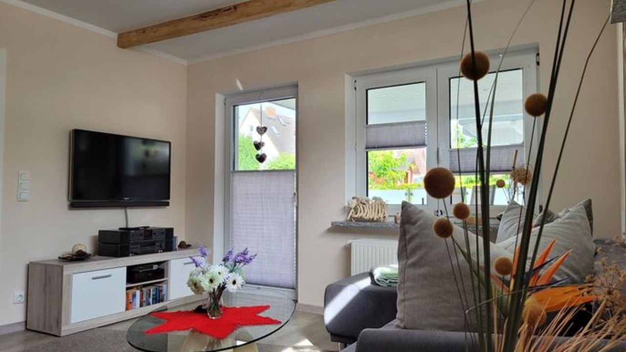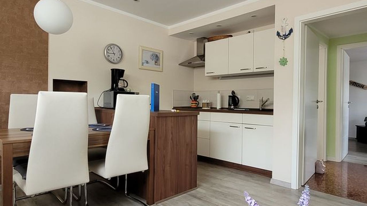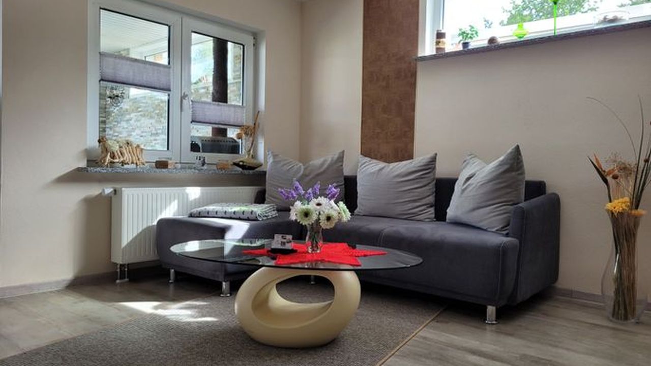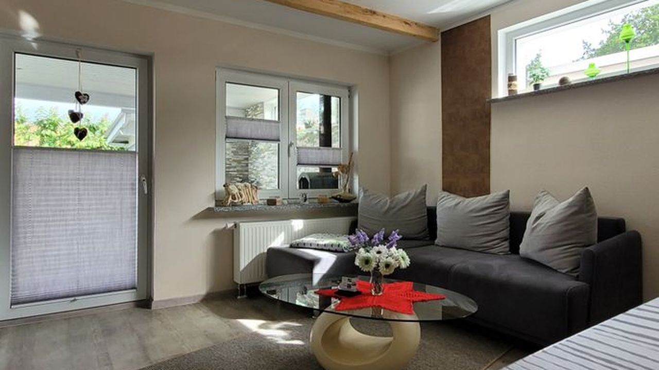 Die Wohnung befindet sich in einem separaten Gebäude auf dem Hof der Gastgeber.Sie ist ausgestattet mit einem Flur, einem Bad mit ebenerdiger Dusche, einem Schlafzimmer mit Doppelbett (1,80 Meter breit) und Schlafcouch, einem Wohnzimmer mit integrierter Küche sowie einem Essbereich ausgestattet. Ein TV ist natürlich sowohl im WZ, als auch im SZ vorhanden, ebenso wie kostenfreies W-LAN. Die Küche ist mit einem 2 flammigen Induktionsherd und einem Kühlschrank ausgerüstet, eine gemütliche überdachte Terrasse lädt zum Verweilen und Relaxen ein.