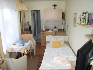 Das liebevoll eingerichtete Single- Zimmer bietet genügend Raum für eine Person.Neben Kleiderschrank und einem Bett mit verstellbarem Kopf- und Fussteil gehören ein Tisch mit 2 kleinen Sesseln, Fernsehgerät, Pantryküche mit Kühlschrank, Kaffeemaschine, Toaster, Eierkocher, Mikrowelle sowie Besteck und Geschirr zur Einrichtung. Das Badezimmer ist mit Waschtisch, Dusche und WC ausgestattet.