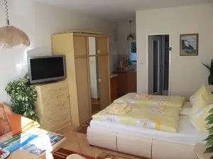 Die Appartements 1 und 2 für 2 Personen sind kleine, zweckmässig ausgestattete Wohnungen in einem Raum. Im kombinierten Wohn- Schlafraum befinden sich eine Ledercouchgarnitur mit Tisch zum Fernsehen und Erholen, das mittig getrennte französische Bett mit verstellbarem Kopf- und Fussteil, ein 3-türiger Schiebetürschrank mit Ganzkörperspiegel sowie eine Kochnische mit Pantryküche (mit Fenster zur zusätzlichen Belüftung beim Kochen). Die Pantryküche ist bestückt mit Kaffeemaschine, Mikrowelle, Toaster, Eierkocher sowie Bestecken, Geschirr und Töpfen.Selbstverständlich gehören zur Einrichtung der Appartements auch Fernsehgerät und Radio.