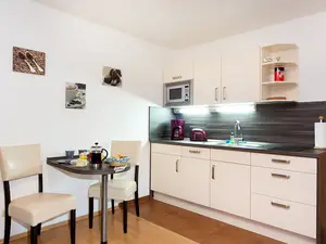Unsere 40 qm große Ferienwohnung, ausgestattet für 2-3 Personen, besteht aus einem Wohnzimmer mit Kochnische, einem Schlafzimmer und einem Bad mit Dusche und WC.Im Kochbereich befinden sich ein Geschirrspüler, Ceranfeld, Kühlschrank, Mikrowelle, Toaster, Kaffeemaschine und Wasserkocher.