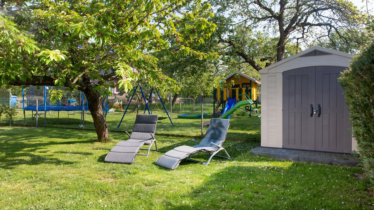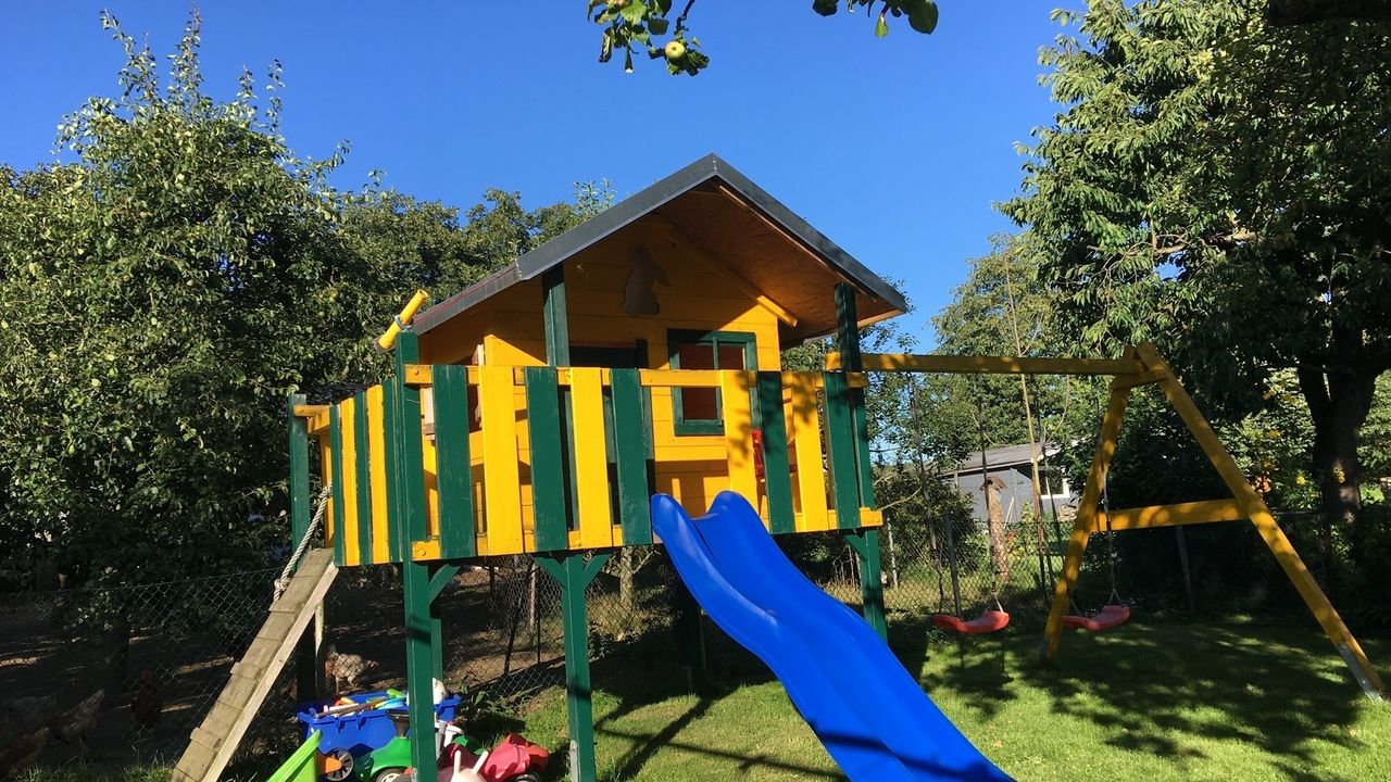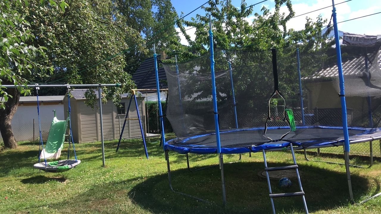 Zum Haus gehört eine Terrasse mit Gartenmöbeln, Spielplatz mit Trampolin, Sonnenschirm und Grill.