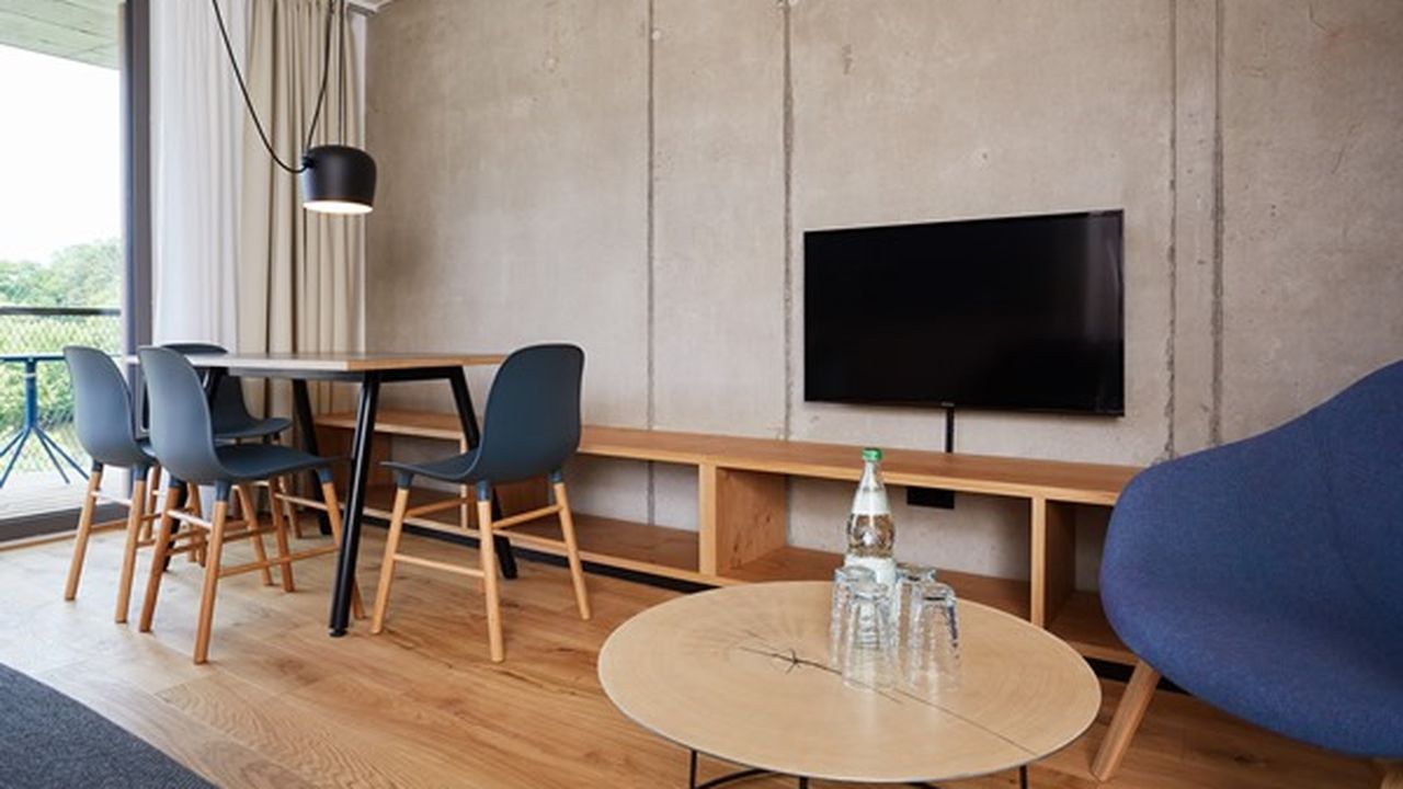 - Großzügiger Wohnbereich mit Fernseher und ausziehbarem Sofa (das Sofa kann gegen Aufpreis als Zusatzbett für Kinder genutzt werden)