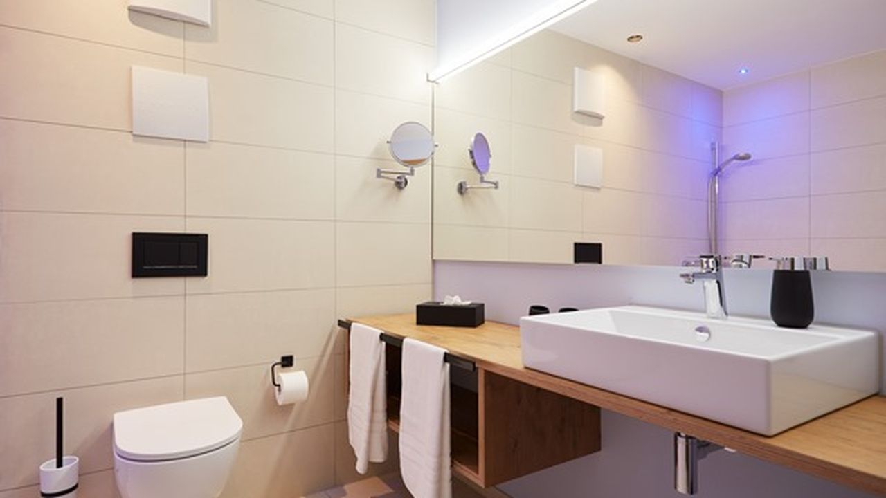 - Eigenes Bad mit Dusche, Waschtisch, WC, Haartrockner, Kosmetikspiegel