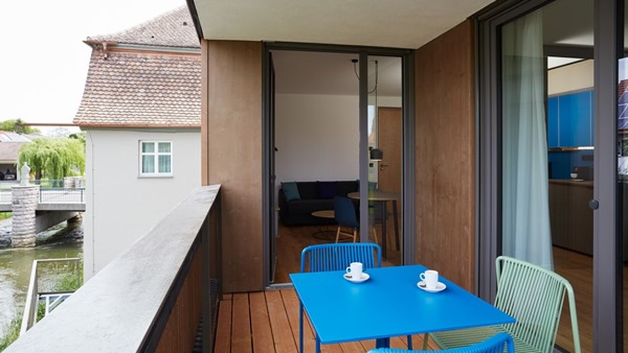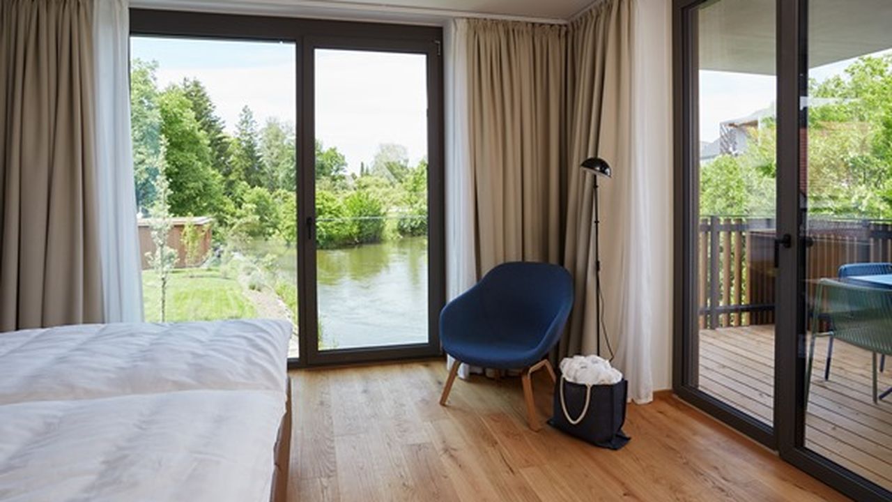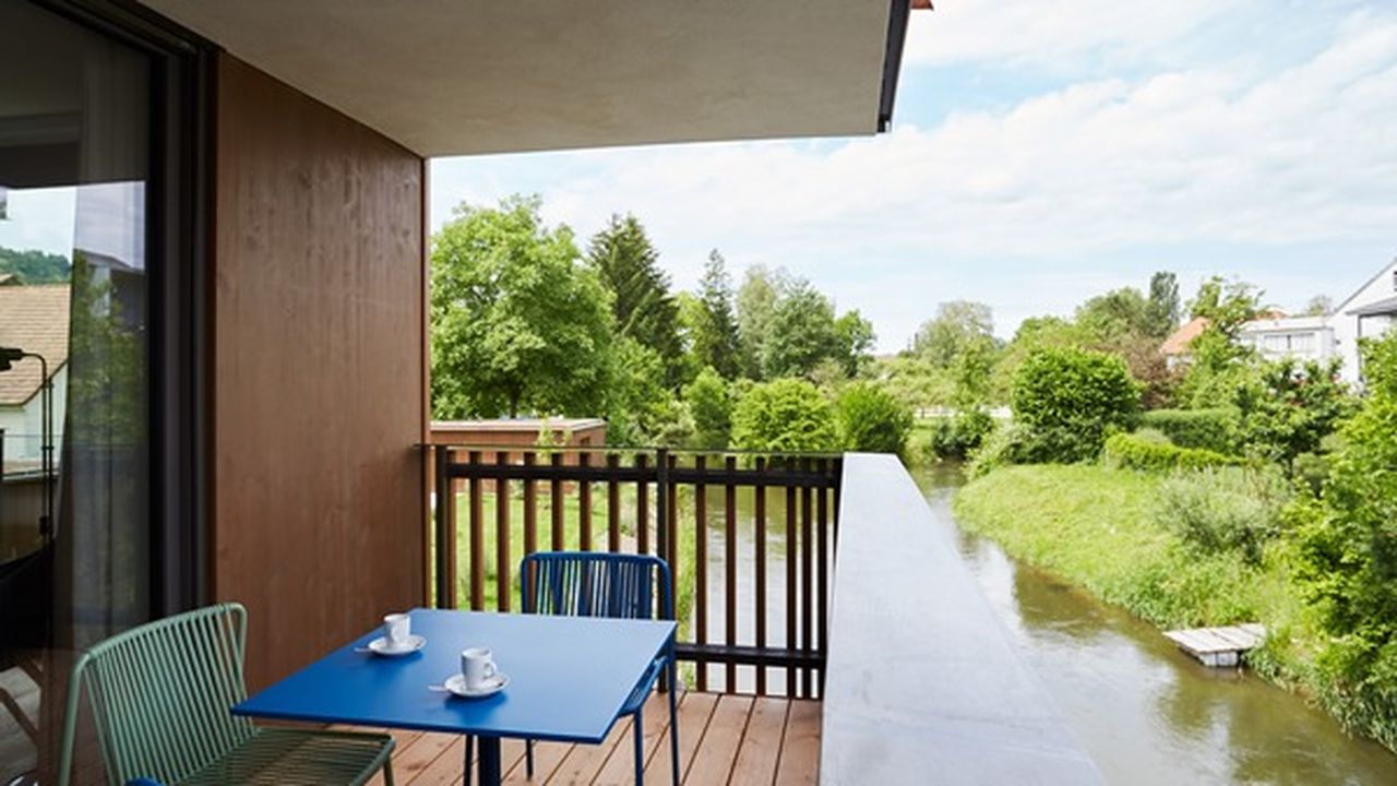 Das Apartment AM UFER befindet sich im 1.OG des Neubaus. Dieses Apartment liegt direkt am Ufer der Aach und bietet Ihnen einen idyllischen Ausblick auf den Flusslauf. Auf der einzigartigen überdachten Loggia sitzen Sie über dem Wasser. Sie haben eine traumhafte Aussicht auf den Galgenberg und auf den Kirchturm, welcher abends dezent beleuchtet wird.