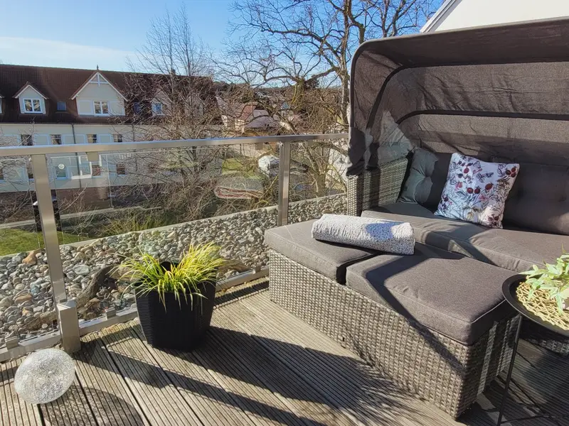 Von hier aus gelangen Sie auf den Balkon, der Küche und Schlafzimmer verbindet. Auf der Dachterrasse können Sie im Liegestuhl oder in Ihrem Starndkorb entspannen.