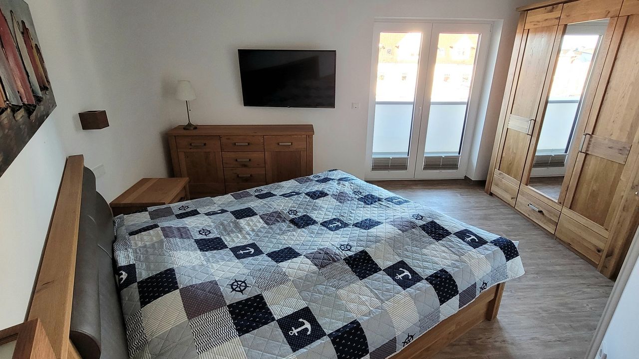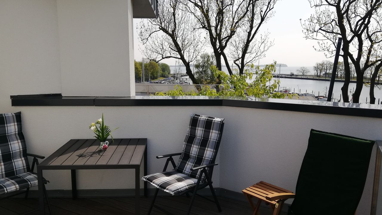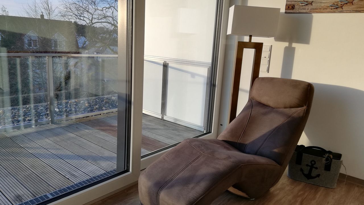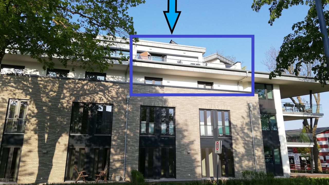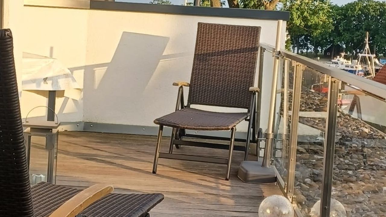 Die Wohnung verläuft über 2 Etagen ( Penthouse) und über eine massive Holztreppe gelangen Sie in das Obergeschoss mit einer großen Dachterrasse und haben einen wunderschönen Ausblick über den Hafen und den Bodden. Die hohen Fensterfronten (Schiebeelemente) im Studio lassen viel Leichteinfall zu und sind zudem verdunkelbar.