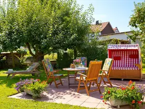 Liegewiese, überdachte Weinlaube mit Grillmöglichkeit, Parkplätze vorm Haus, Gefriermöglichkeit und Leihfahrräder runden das Angebot ab.