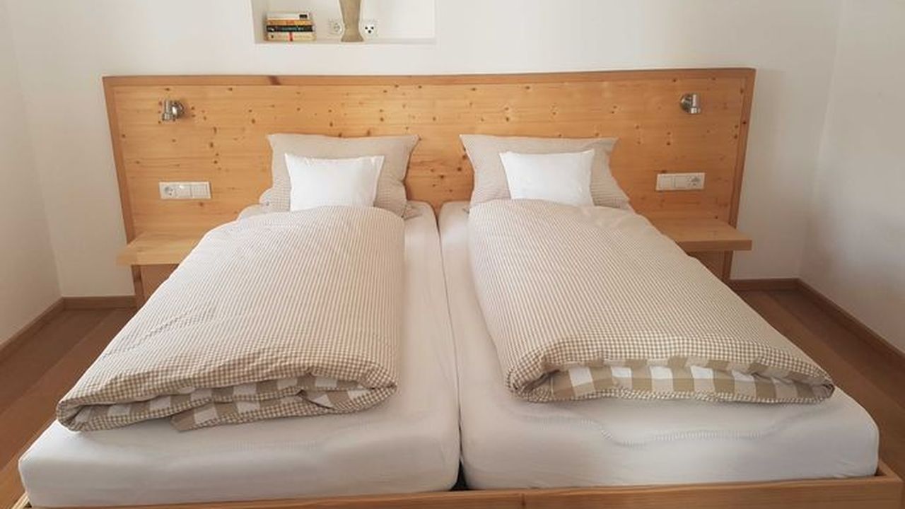 Das Schlafzimmer mit Doppelbett 180 x 200 cm und hochwertigen Matratzen bietet genügend Platz und ist mit zwei geräumigen Schränken und einem Tisch
