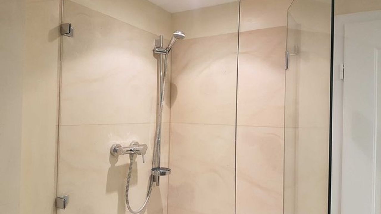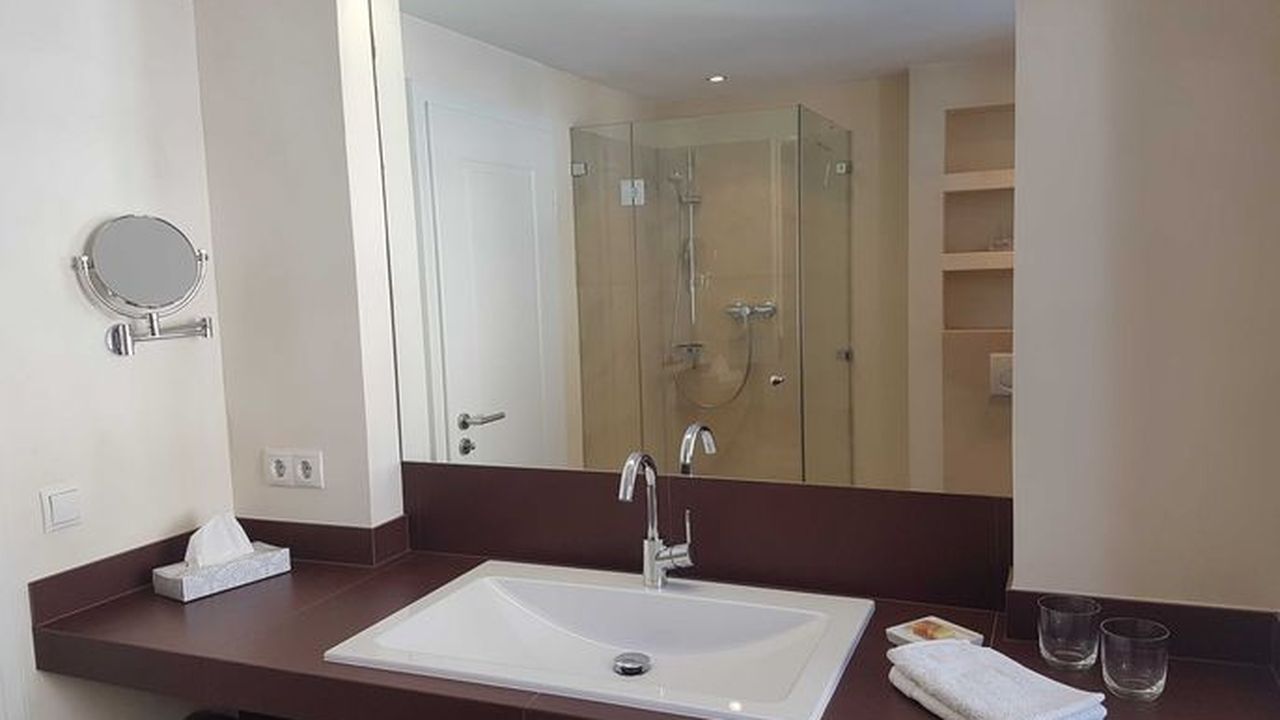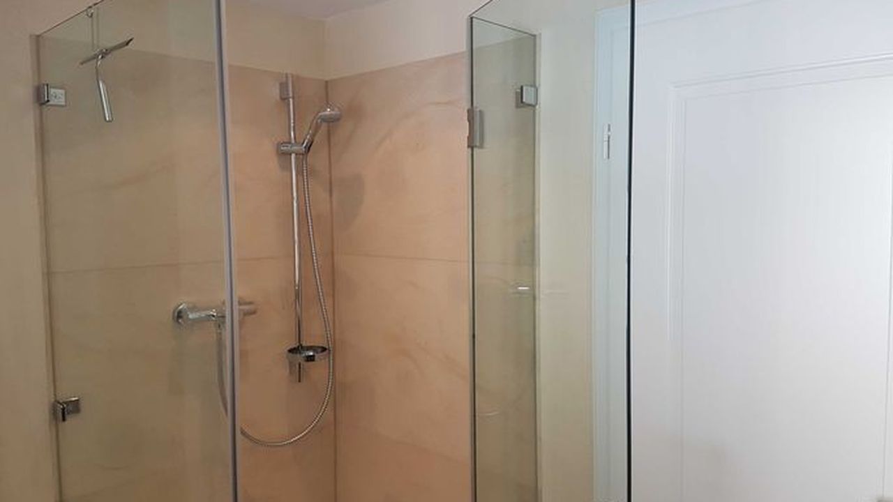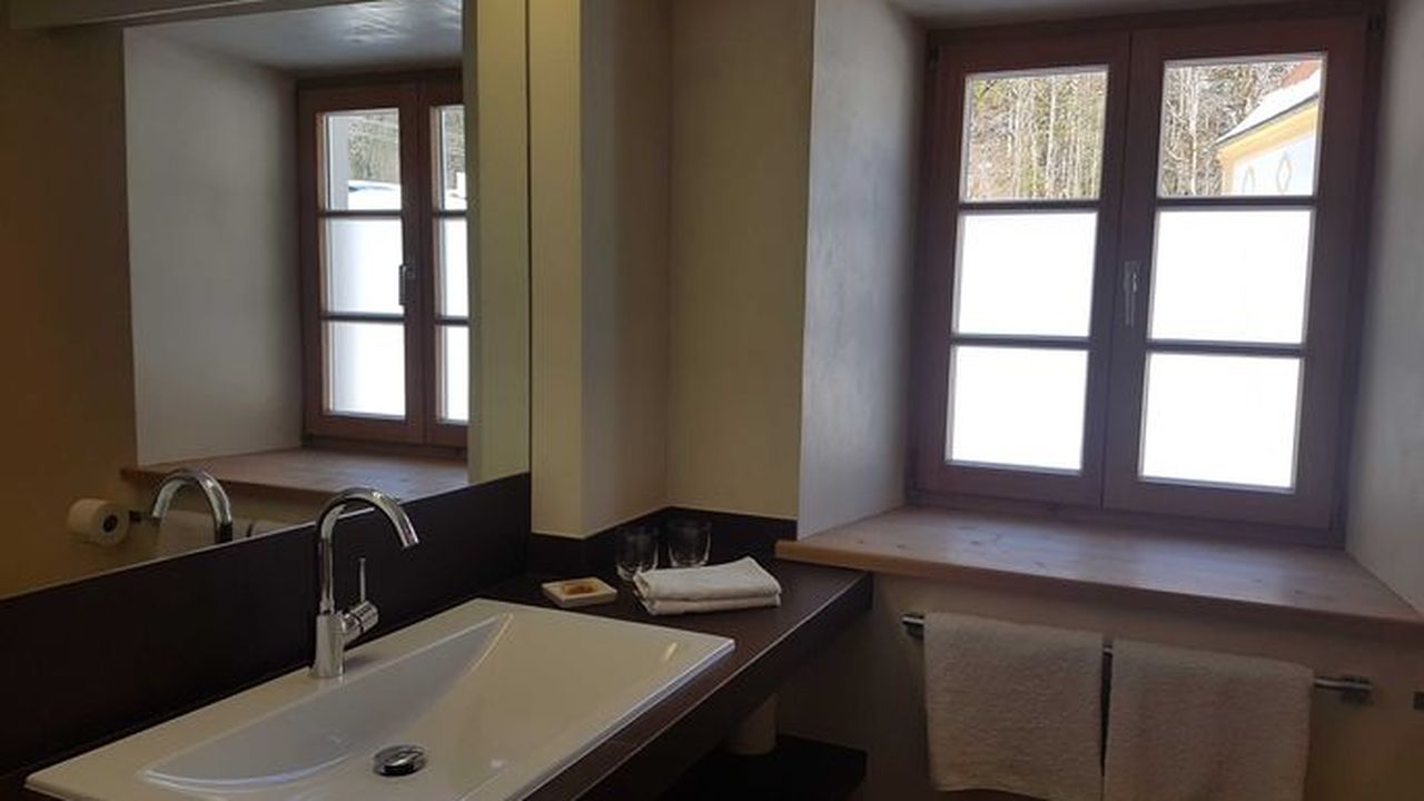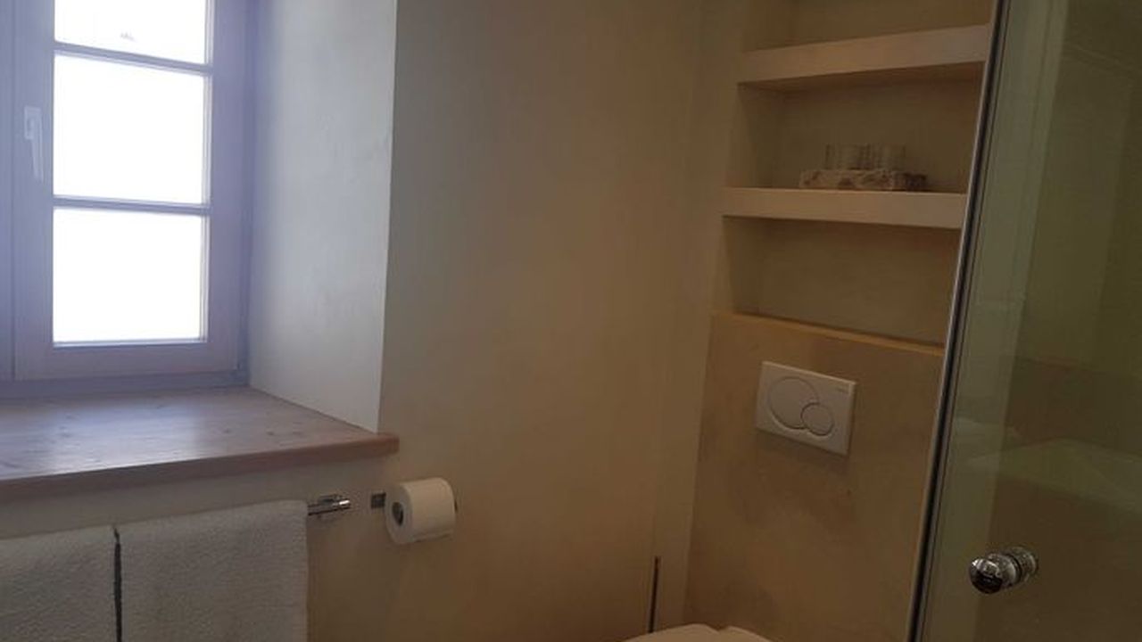 Im Bad ist hochwertiger Naturstein verlegt, ausgestattet mit Dusche/WC und großem Waschtisch. Neben Fön, Schminkspiegel und Seife liegen genügend Handtücher für Sie bereit.