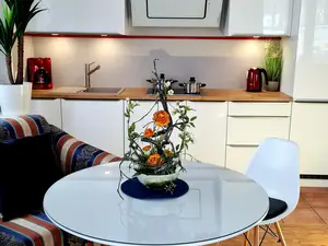 Die Ferienwohnung ist mit schönen Bildern, komfortablen Betten und modernen Möbel ausgestattet. Zum Apartment gehört ein Balkon mit bequemen Liegestühlen.