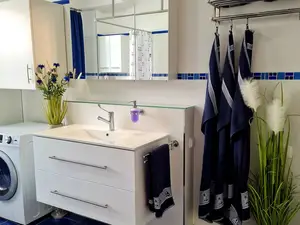 Im Bad finden Sie eine Waschmaschine, Wäscheständer, Bügelbrett, Bügeleisen, Staubsauger, Haartrockner, Kosmetikspiegel, Schränke, Komfort- WC und eine große Dusche.