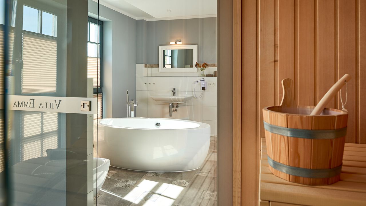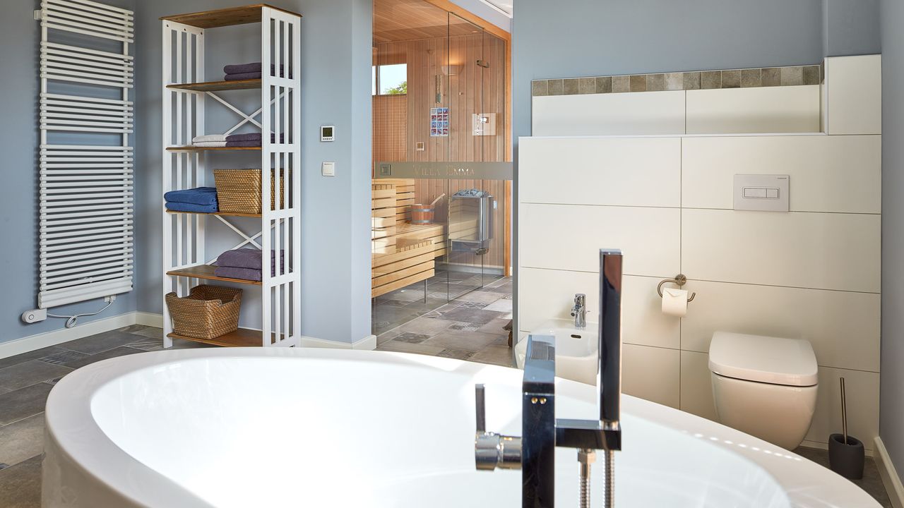Bad: 2 Waschbecken, WC, Bidet, Sauna mit Ruhebereich , Badewanne, XXL-Dusche ebenerdig, Fußbodenheizung, Fön, Duschgel, Kindertoilettensitz, Kindertöpfchen, Musikanlage