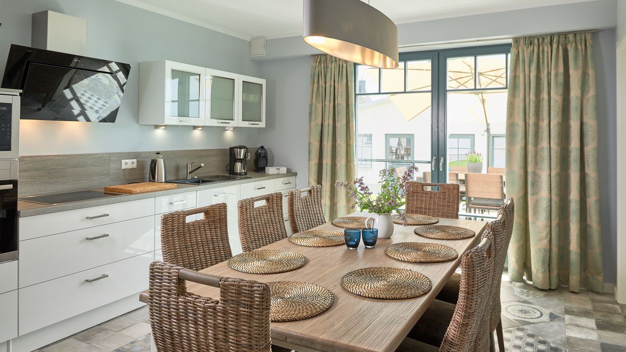 Küche: Einbauküche mit Geräten,Geschirr und Besteck,Geschirrspülmaschine,Kühlschrank mit Gefrierfach, Mikrowelle, Cerankochfeld, Backofen, Waschtrockner, Kaffeemaschine, Kaffeevollautomat, Toaster, Wasserkocher, Esstisch für bis zu 8 Pers., 1 Kinderhochstuhl