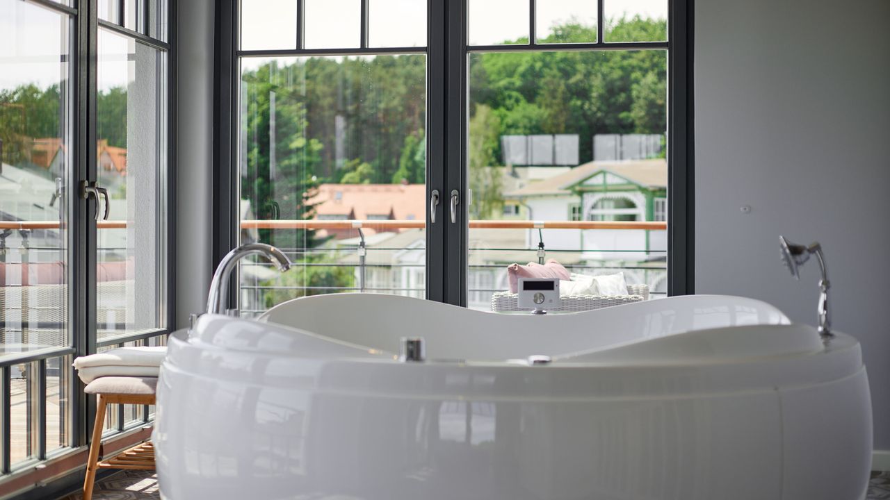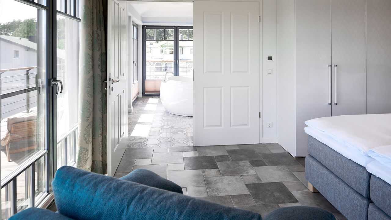 Die Villa "Emma" ist modern bis luxuriös eingerichtet. Hier können Sie sich dank des hohen Komforts sofort wie zu Hause fühlen. Es warten auf Sie 2 Vollgeschosse und ein Penthouse mit innen liegendem Whirlpool, 40 m² Dachterrasse mit Blick über Sellin, einer großen Sauna mit Glasfront und Blick in die Natur, ein extra Ruhebereich mit Relaxliegen, Kamin, WLAN in der gesamten Villa uvm. Von der Villa aus sind es nur wenige Meter bis zur Wilhelmstraße, der Ostsee und dem Selliner See.Die großzügige und modern eingerichtete Villenhälfte ist 210 m² groß.