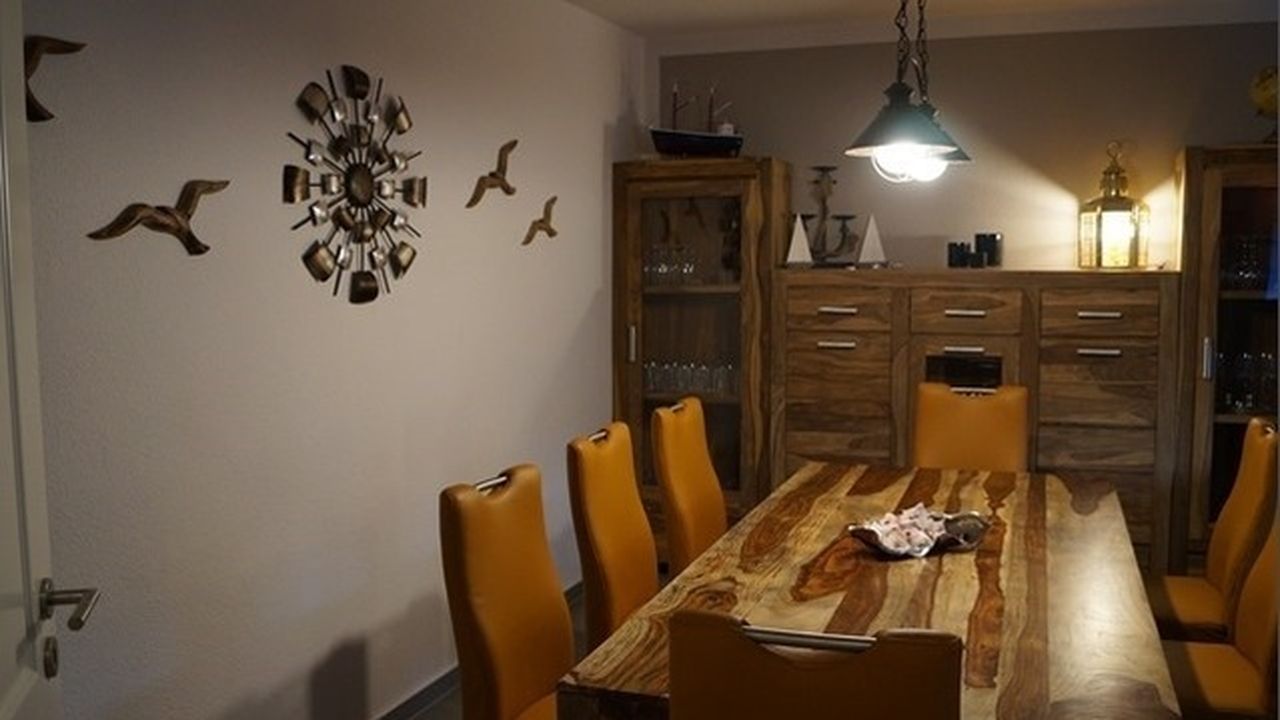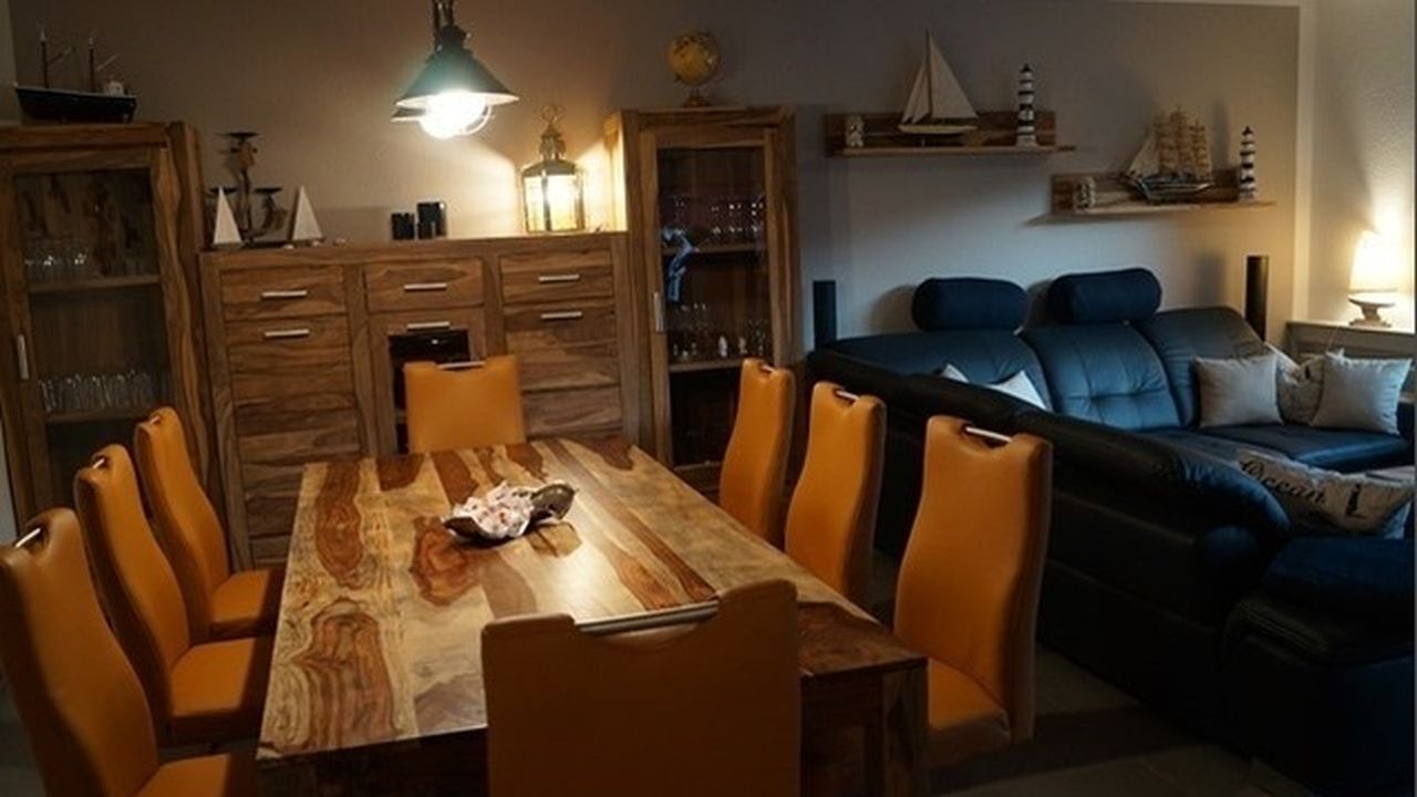- Wohn- / Essbereich mit gemütlicher Ledercouch und großem Esstisch für 8 Personen