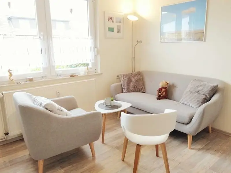 Die gemütliche Ferienwohnung verfügt über 68 m² Wohnfläche und bietet für vier bis fünf Personen ausreichend Platz für einen erholsamen Urlaub. Die separate Küche mit Essplatz ist mit einem Backofen und einem Kochfeld mit vier Herdplatten, einer Geschirrspülmaschine, einem Kühlschrank, einem Gefrierschrank, Mikrowelle, Kaffeemaschine, Wasserkocher, Toaster und Waschmaschine ausgestattet. Das Wohnzimmer verfügt über ein gemütliches Sofa sowie einen Fernseher mit Satellitenempfang. Der Essplatz ist im Wohnzimmer integriert. Dem Wohnzimmer schließt sich ein Schlafzimmer mit Doppelbett an. Über eine Raumspartreppe gelangen Sie in den oberen Stock. Hier finden Sie ein Schlafzimmer (Galerie) mit Doppelbett und ein Kinderzimmer mit Schlafsofa. Die Zimmer sind durch Außenrollos abdunkelbar. Der Wohnung schließt sich ein kleines Stück Garten mit Strandkorb an. Zum Strand sind es nur wenige Gehminuten. Ein Parkplatz ist direkt am Haus.Hinweis zu Haustiere