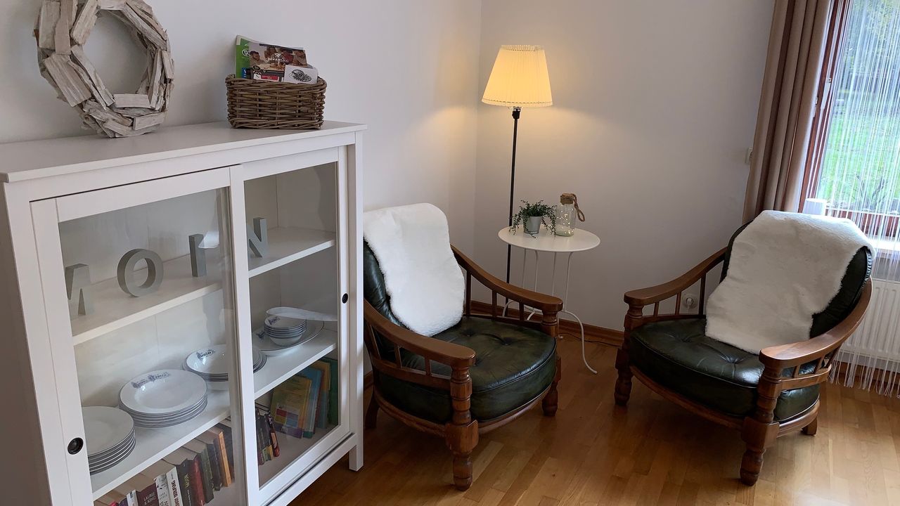 Wohnzimmer: gemütliches Sofa, großer Smart-Flachbildschirmfernseher mit 55" und stilvolle Einrichtung mit Blick in den Garten.