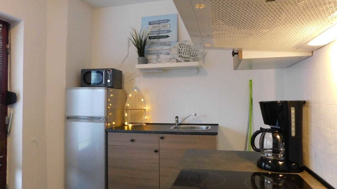 Küche: durch eine 2-stufige Treppe erreichbar. Neue Einrichtung mit Kühlschrank, Mikrowelle, Kaffeemaschine, etc..