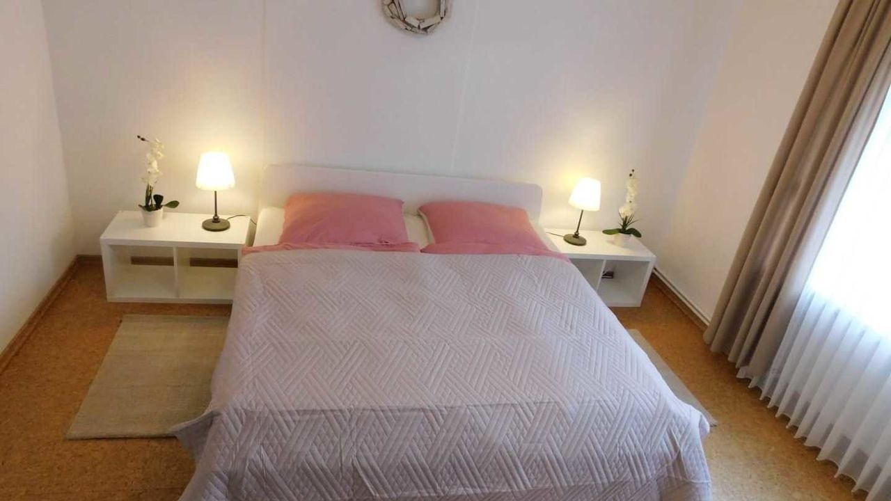 Schlafzimmer 1: ein bequemes Doppelbett, zwei Nachttische mit Leuchten und ein Kleiderschrank