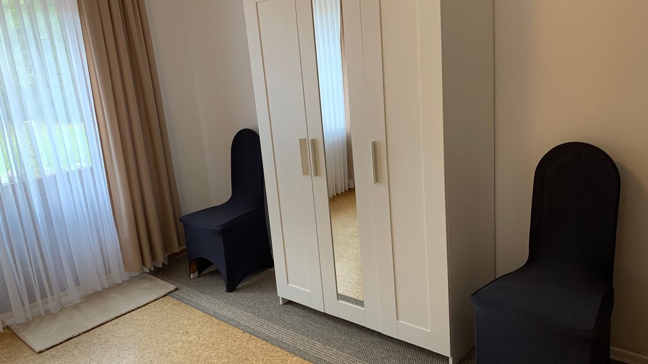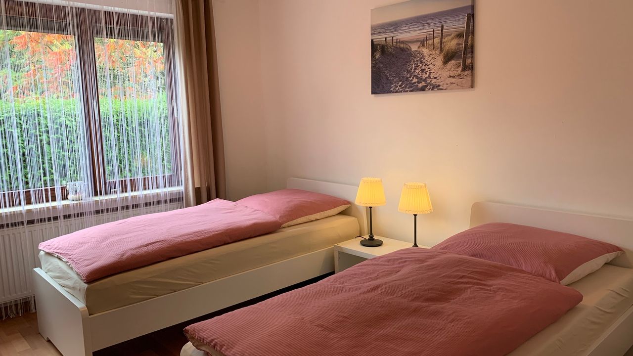 Schlafzimmer 2: zwei bequeme Einzelbetten, Nachttisch mit Leuchten und ein Kleiderschrank