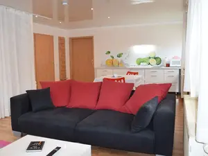 Sehr ruhiges und modernes "Ein - Zimmer - Apartment", 50qm groß.Der Wohnzimmerbereich ist mir einem TV, einem Big Sofa, vielen Kissen und Kuscheldecken gemütlich eingerichtet.