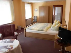 Das ca. 25 m² große Doppelzimmer liegt im Erdgeschoss des Haupthauses. Das Doppelzimmer ist mit einem Doppelbett, Kleiderschrank und TV-Gerät eingerichtet. Das eigene Badezimmer ist mit einer Dusche und WC ausgestattet. Weitere Angaben: Bettwäsche, Handtücher und Frühstück sind im Preis inklusive.Beschreibung der Unterkunft