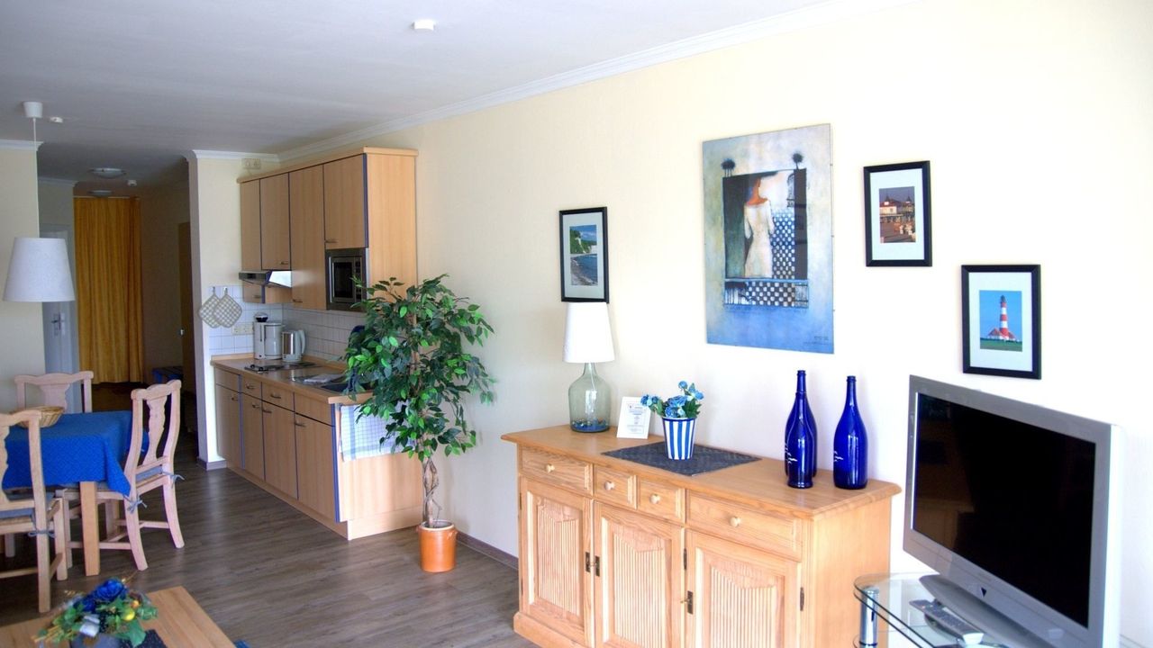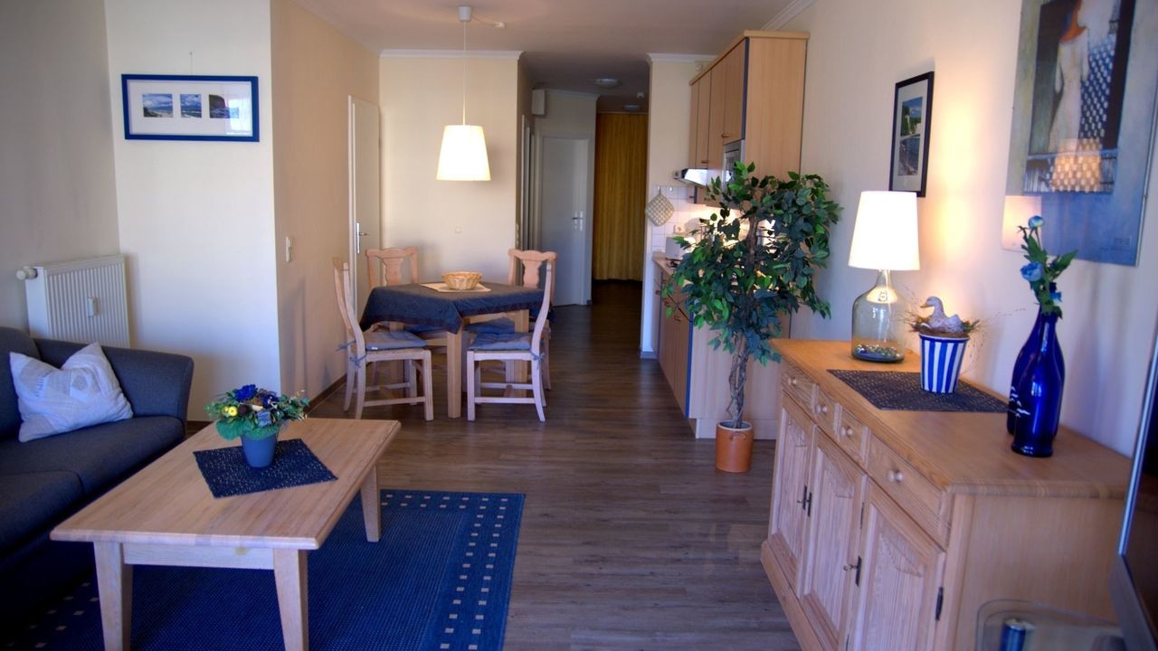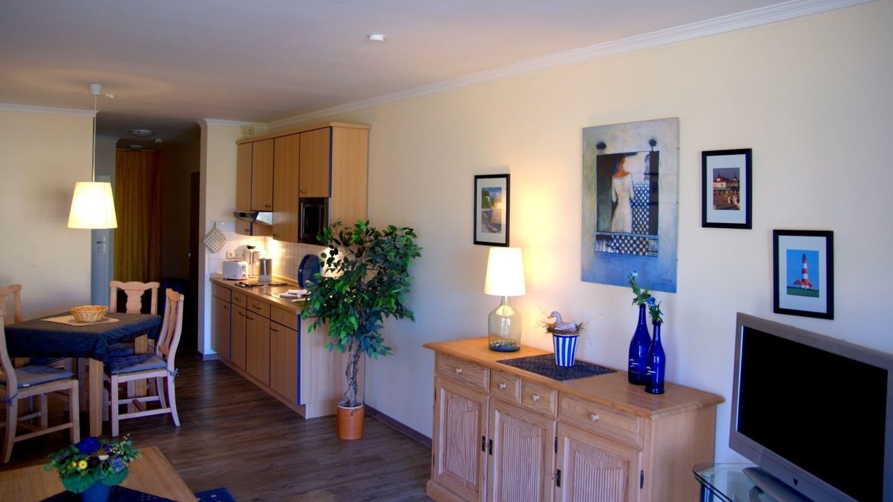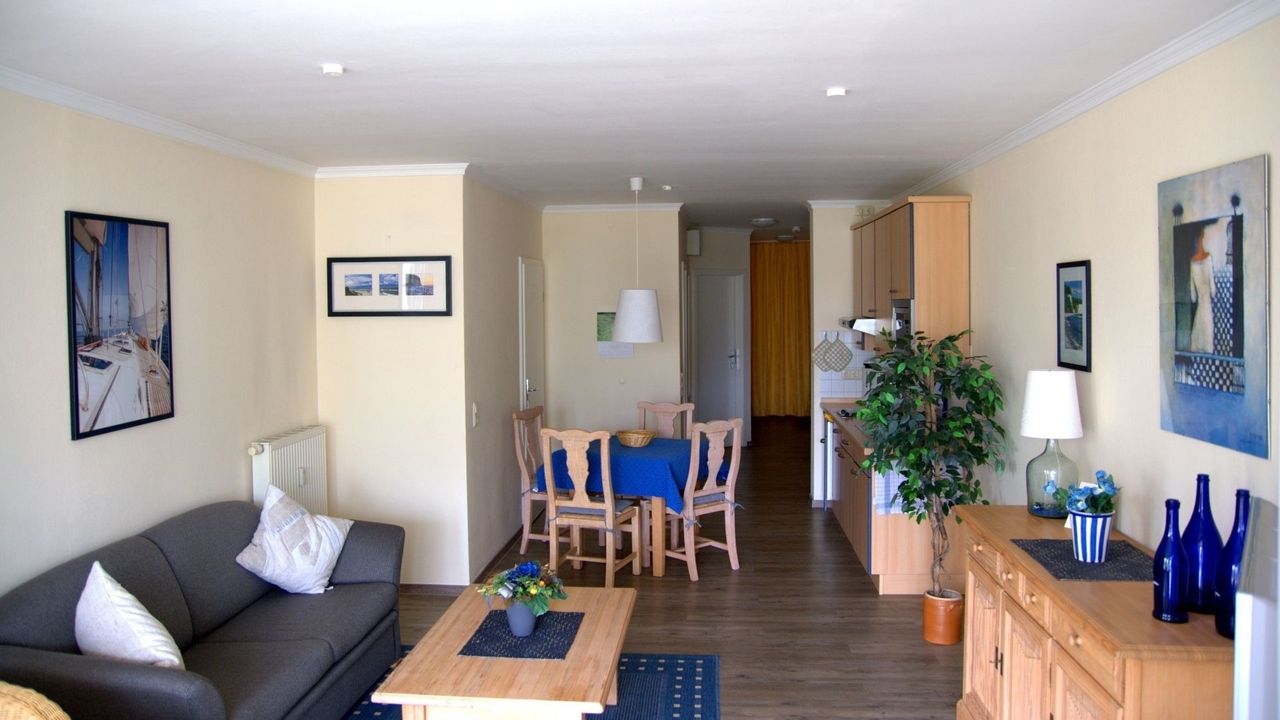 Das Ferienappartement selbst besteht aus einem großen, hellen Wohnzimmer mit breiter Fensterfront zur Loggia, einer Essecke mit integrierter Pantryküchenzeile, einem separaten Schlafzimmer, sowie einem Bad mit WC und Dusche. Für Kinder bietet die Wohnung auch an Regentagen genügend Platz zum Spielen.