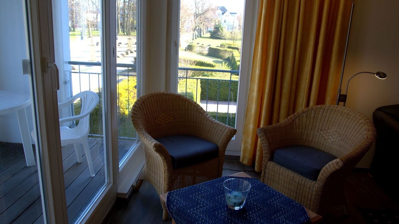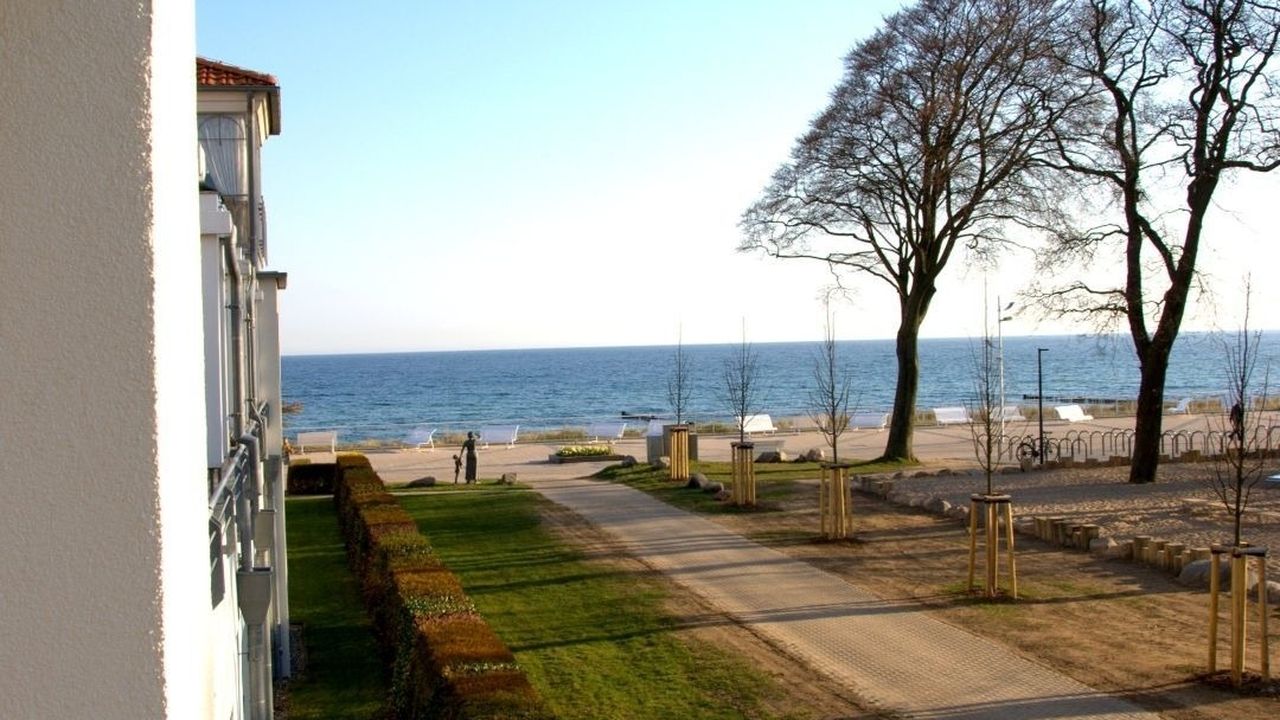 Top-Ferienwohnung im Haus Meeresblick in bester Lage direkt an der Strandpromenade in Kühlungsborn West mit grandiosem Meerblick und Erholungsmöglichkeit in der eigenen Park-LoggiaDie Wohnung befindet sich an der Ostseite des Hauses Meeresblick zum Strand und Park hin gelegen. Da es sich hierbei um eine Eckwohnung im ersten Stockwerk handelt, besticht diese nicht nur durch einen grandiosen Ausblick auf das offene Meer, sondern auch mit ihrer ruhigen, von außen nicht einsehbaren Lage. Aus diesem Grunde lädt speziell die großzügige Loggia, die durch ihre diskrete Bauweise Ruhe bietet und keinen direkten Nachbarkontakt hat, zum Verweilen ein. Von hier kann man z.B. besonders beim morgendlichen Frühstück die Sonne und den Blick auf das Meer genießen.