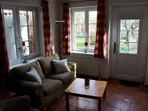 Unsere Ferienwohnung "Möwennest" bietet mit 60 m² Platz für 4 Personen.Vom Wohnzimmer blickt man in den Garten hinein, es folgt angrenzend unser Feld.