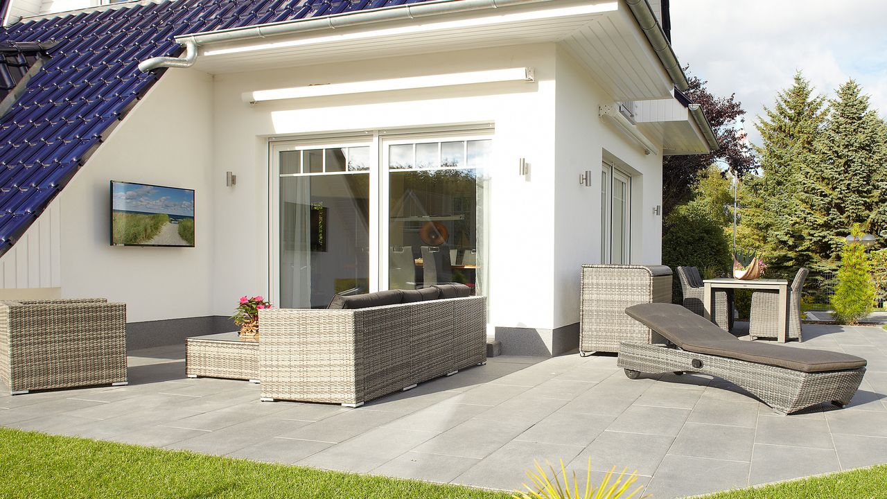 Große Sonnenterrasse mit Rattan-Couchmöbeln, Outdoor-TV und Markisen, Fußbodenheizung im gesamten Haus, jeder Raum ist mit individuellen Möbeln und LED-TV ausgestattet, gutes Raumklima dank Niedrigenergiehaus. Alle Schlafräume sind mit Fliegengitter ausgestattet. Bei dem 3. Schlafzimmer handelt es sich um einen ausgebauten Schlafboden mit verringerter Stehhöhe, welcher vom 2. Schlafzimmer zu erreichen ist.