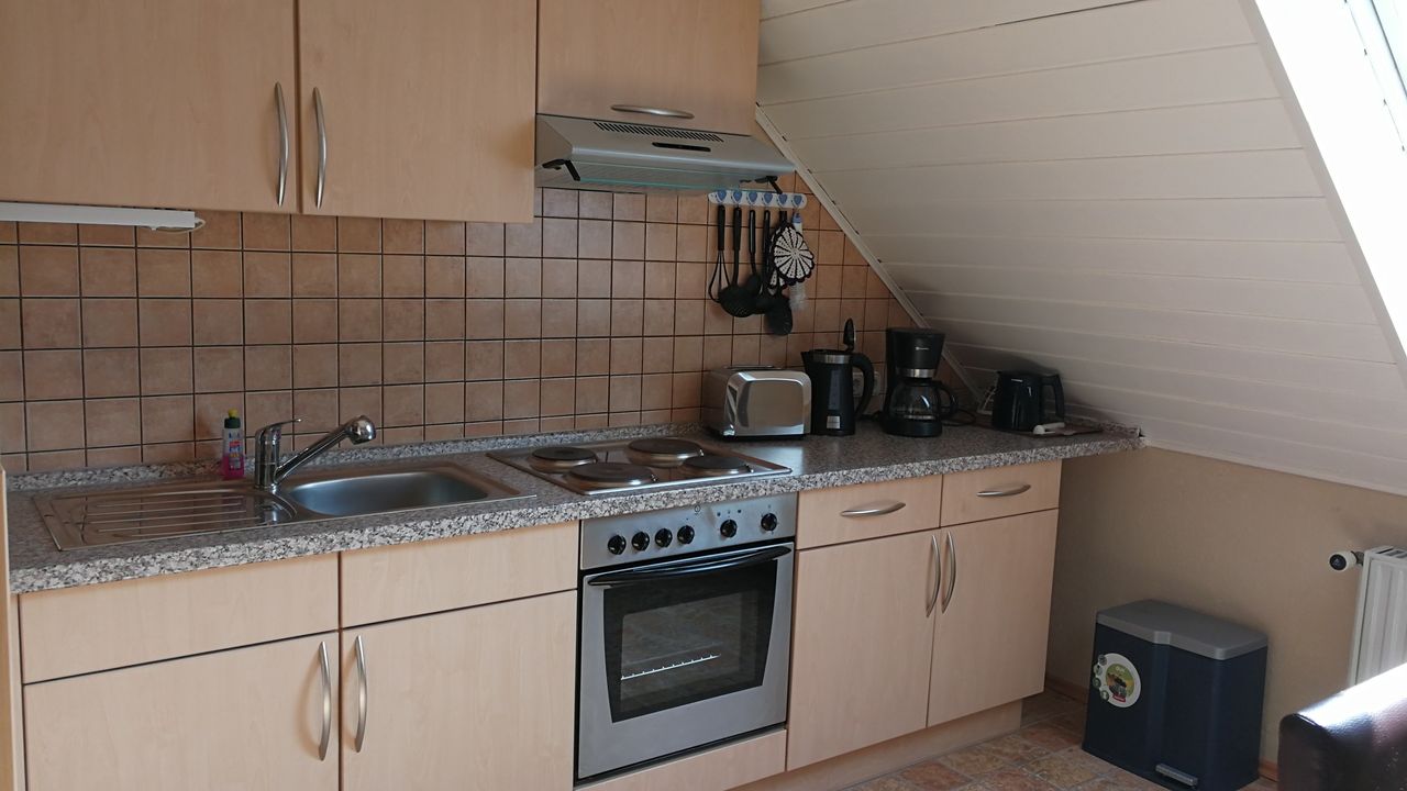 Die gut ausgestattete Küche besitzt unter anderem einen Kühlschrank, einen Herd zum Kochen und sogar eine Spülmaschine.