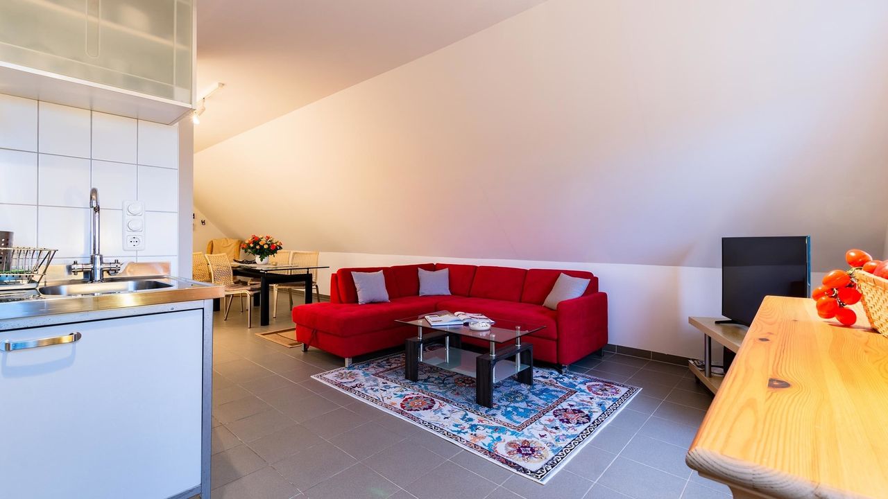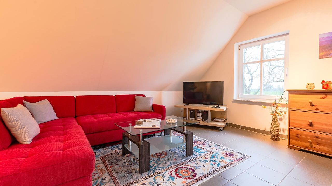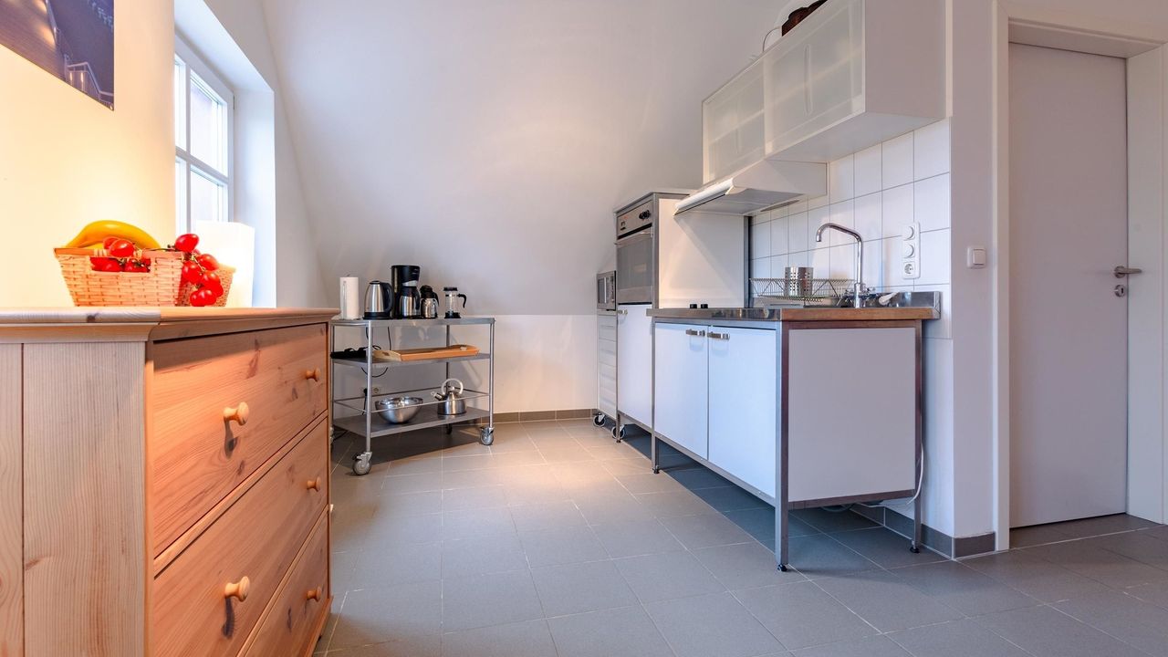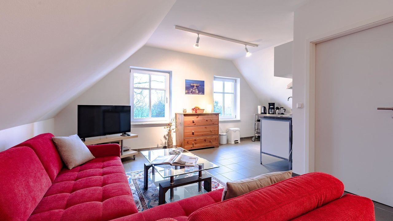 Das gesamte obere Geschoss bildet eine sehr geschmackvoll eingerichtete Ferienwohnung Apfelgarten. Im großzügigen, offenen Wohn-/Essbereich gibt es einen großen Esstisch mit vier Stühlen. Zum Relaxen lädt eine gemütliche Eck-Couch ein, die schnell zum Bett umgebaut werden kann. Hier kann eine zusätzliche Person bequem schlafen. Die offene Küche ist voll ausgestattet. Im angrenzenden Schlafzimmer haben Sie ein klassisches Doppelbett und einen Schrank.Die Küche verfügt u.a. über eine Spülmaschine, Cerankochfeld, Backofen, Mikrowelle, Kaffeemaschine, Wasserkocher. Sie haben SAT-TV und freies WLAN. Die Räume haben Fußbodenheizung und Fliesenboden. Das Bad ist ausgestattet mit Dusche und WC sowie einer Waschmaschine.