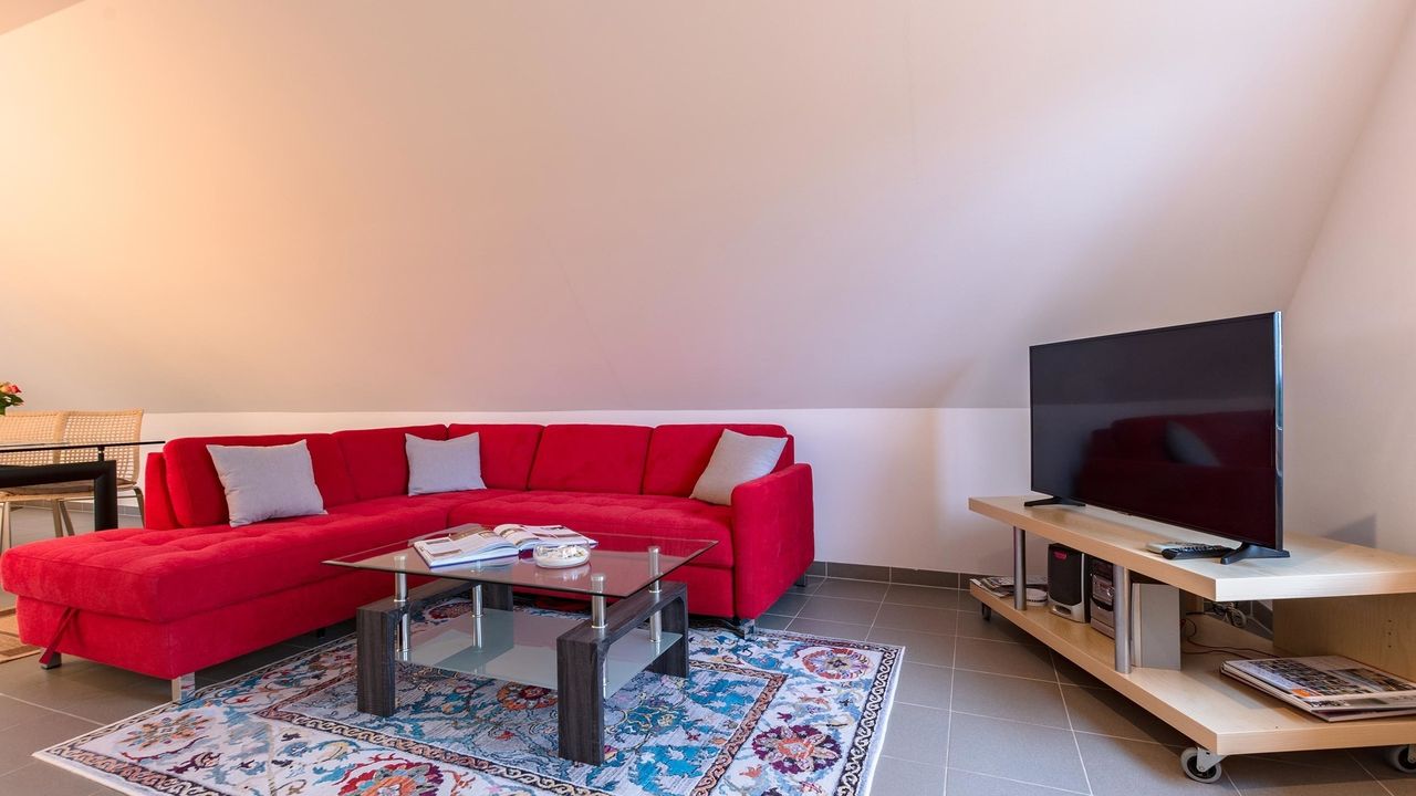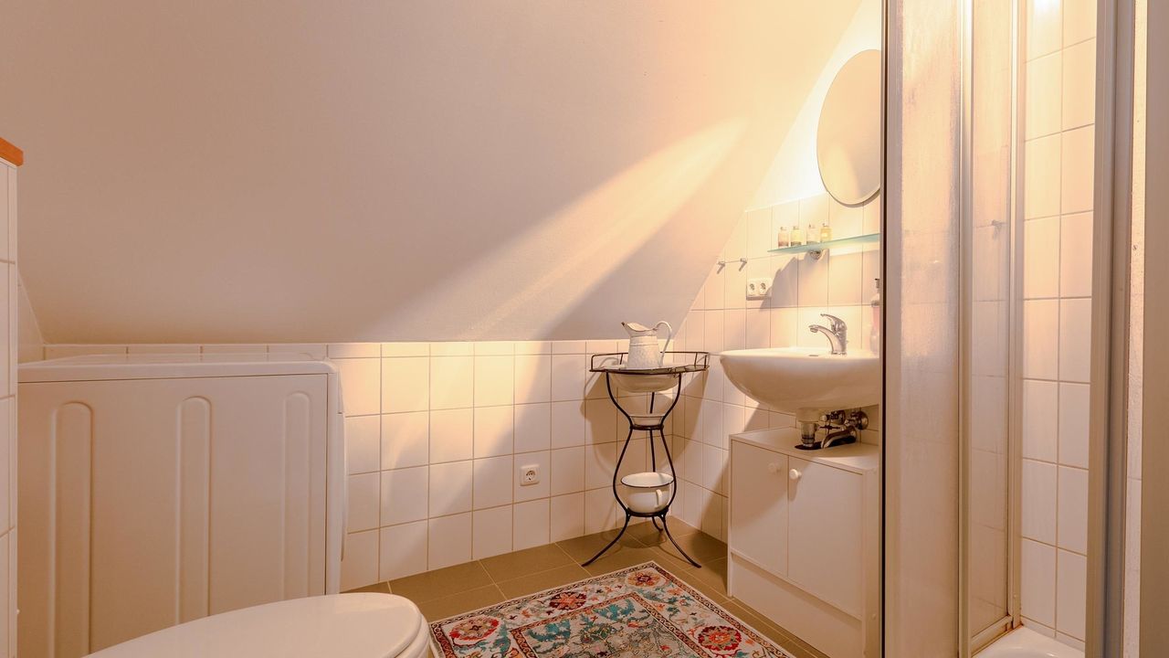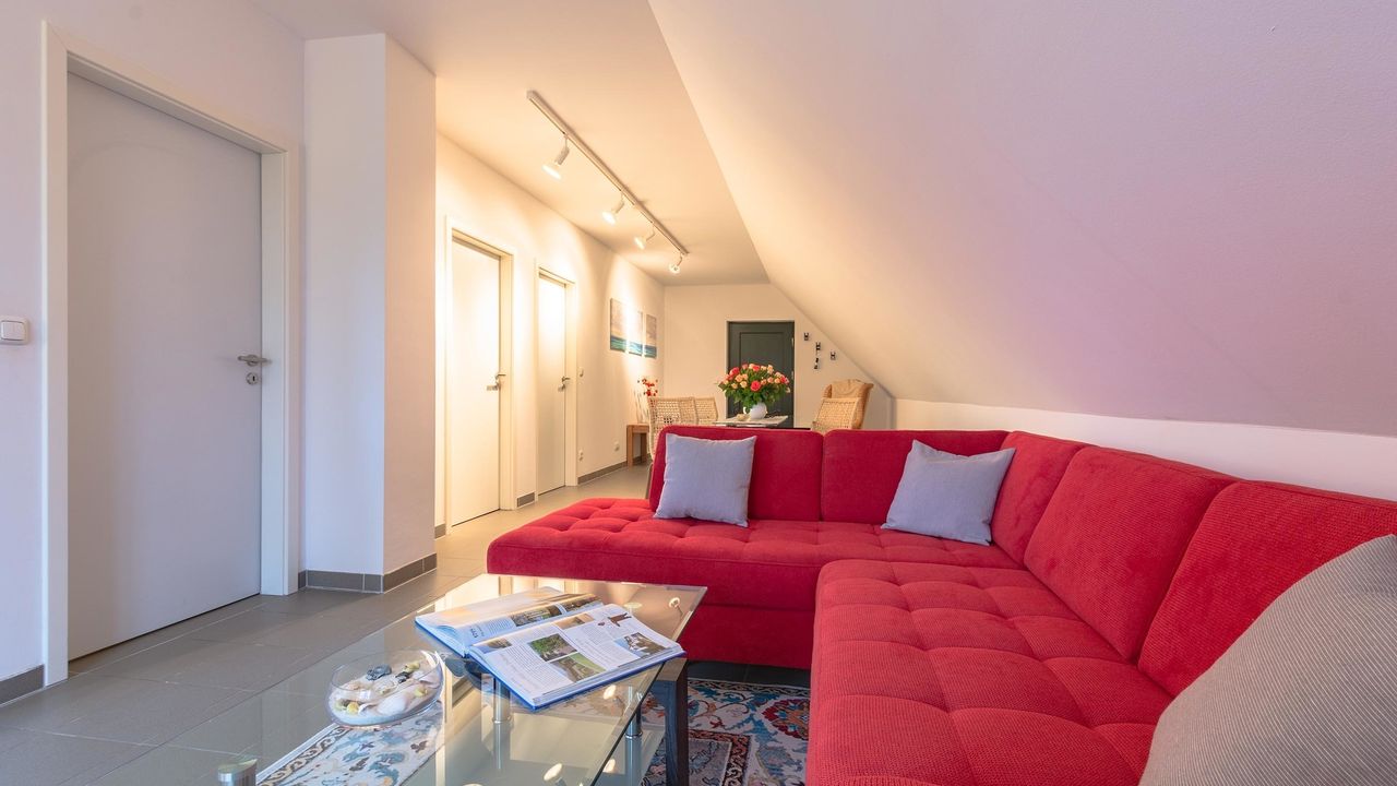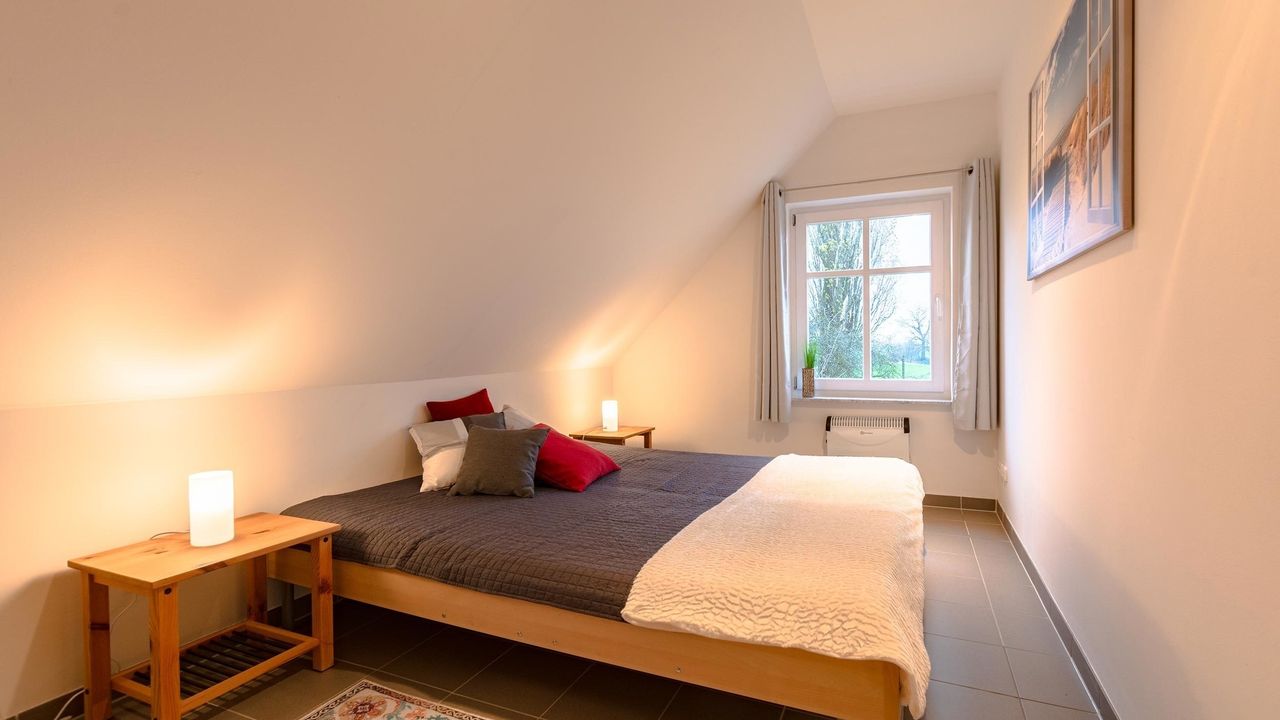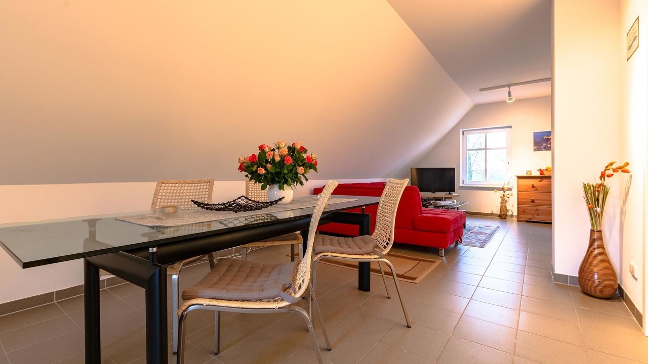 Das gesamte obere Geschoss bildet eine sehr geschmackvoll eingerichtete Ferienwohnung Apfelgarten. Im großzügigen, offenen Wohn-/Essbereich gibt es einen großen Esstisch mit vier Stühlen. Zum Relaxen lädt eine gemütliche Eck-Couch ein, die schnell zum Bett umgebaut werden kann. Hier kann eine zusätzliche Person bequem schlafen. Die offene Küche ist voll ausgestattet. Im angrenzenden Schlafzimmer haben Sie ein klassisches Doppelbett und einen Schrank.Die Küche verfügt u.a. über eine Spülmaschine, Cerankochfeld, Backofen, Mikrowelle, Kaffeemaschine, Wasserkocher. Sie haben SAT-TV und freies WLAN. Die Räume haben Fußbodenheizung und Fliesenboden. Das Bad ist ausgestattet mit Dusche und WC sowie einer Waschmaschine.
