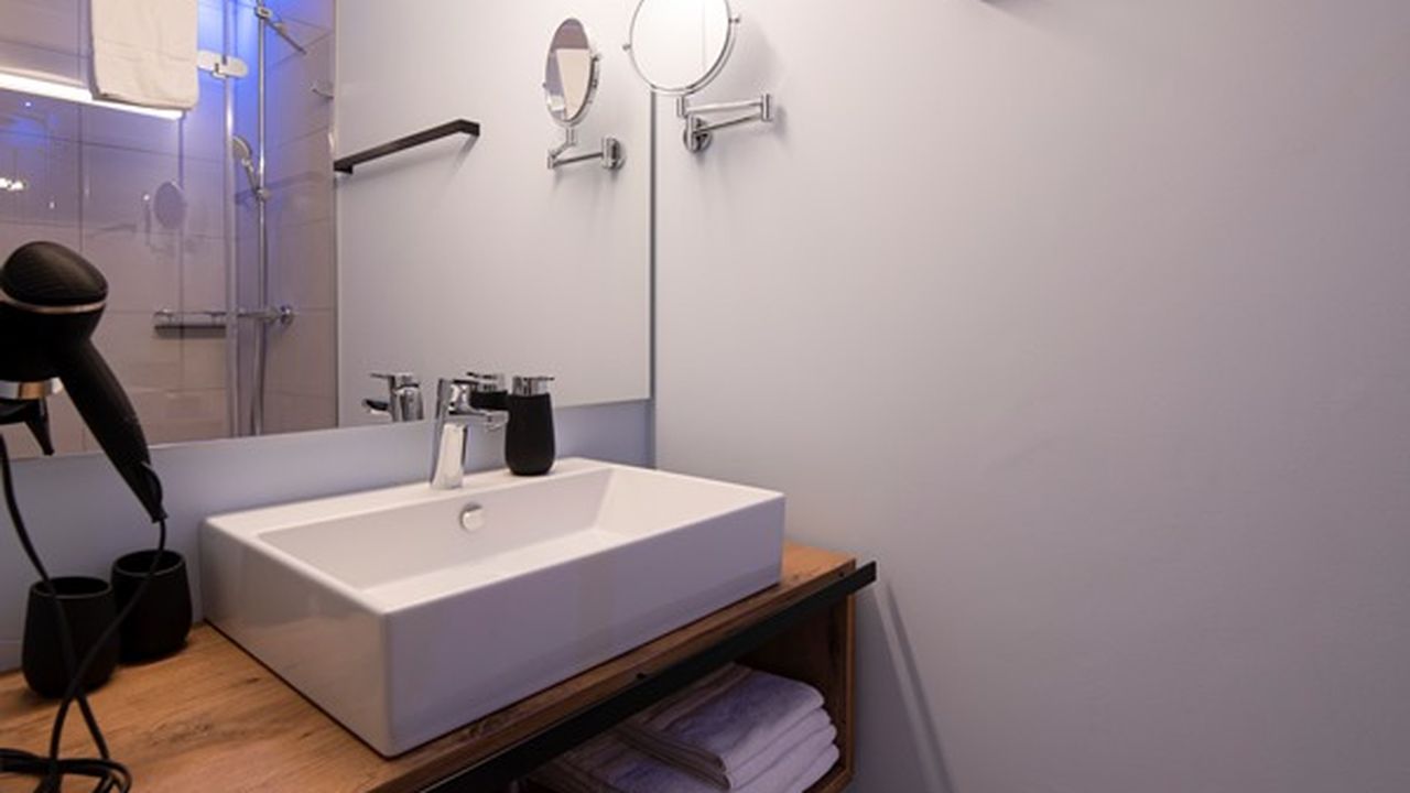 - Eigenes Bad mit Regendusche, Waschtisch, Haartrockner, Kosmetikspiegel