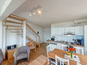 Das große 4-Zimmer-Masionette-Appartement Nr. 14 mit Seeblick und zusätzlichen Schlafraum auf der Empore befindet sich im zweiten und dritten Obergeschoss der Villa Ostseewarte. Auf der unteren Ebene befindet sich ein großer geräumiger Wohnraum mit gemütlicher Sitzgruppe, eine offene, voll ausgestattete Küche mit Kaffeemschine, Wasserkocher, Toaster, Mikrowelle, Backofen und Geschirrspüler sowie einem gemütlichen Essplatz. Das Bad auf der unteren Ebene ist mit Dusche und WC ausgestattet , das separate Schlafzimmer verfügt über ein großes Doppelbett. Ebenfalls auf der unteren Ebene befindet sich der im Sommer möblierte Balkon.Vom Wohnraum aus gelangt man über eine Treppe in die obere Ebene, in der sich zwei weitere Schlafzimmer, eines mit einem Doppelbett und eines mit zwei Einzelbetten sowie ein geräumiges Bad, ausgestattet mit Wanne und WC, befinden. In der oberen Ebene gibt es keine volle Deckenhöhe. Ein Pkw-Stellplatz steht Ihnen auf dem Grundstück kostenfrei zur Verfügung und Ihre Fahrräder können Sie ebenfalls auf dem Grundstück in einem separaten Abstellraum unterbringen. Alle Wohnungen in der Villa Ostseewarte haben passwortgeschütztem DSL-WLAN Internetzugang (gerätegebunden, Euro 1,50 pro Tag und Gerät). Ein FAHRSTUHL wurde nachträglich eingebaut. Eine Waschmaschine können Sie direkt im Haus gegen Gebühr nutzen (Münzgerät).