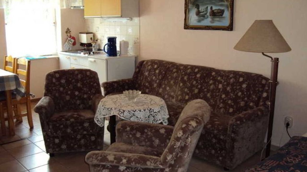 Im kombinierten Wohn- und Schlafbereich befindet sich ein Polsterdoppelbett, eine gemütliche Sitzgruppe, ein Schrank, ein Fernseher und ein Esstisch mit Stühlen. Die kleine Küche ist offen im Wohn- und Schlafbereich integriert. Sie ist ausgestattet mit 2 Elektroplatten, einer Mikrowelle mit Grill, einem Kühlschrank mit Tiefkühlfach, einer Kaffeemaschine, Toaster, Eierkocher und einem Wasserkocher. Im separaten Schlafzimmer stehen 2 voneinander getrennte Betten und ein Kleiderschrank.