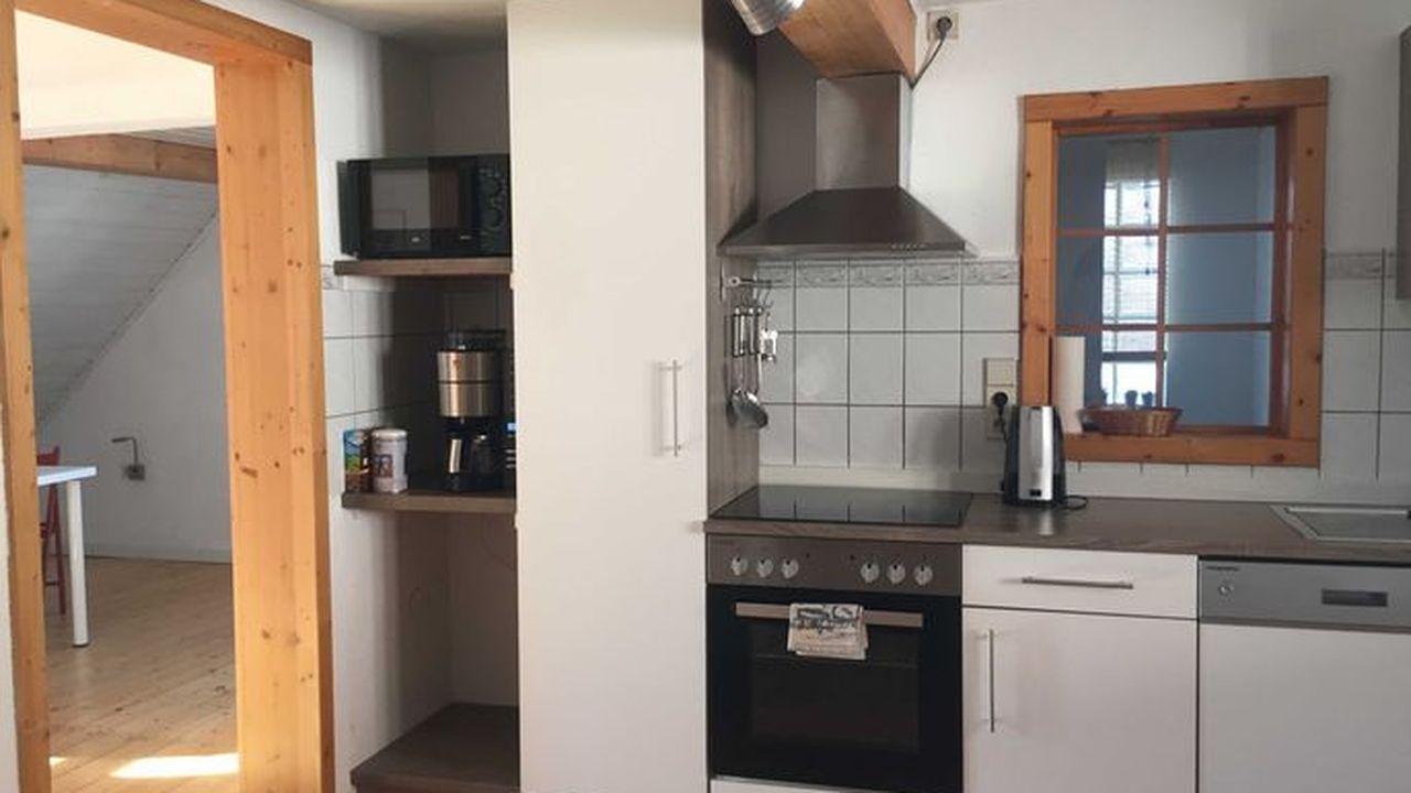 Tisch mit 4 Stühlen, Spülmaschine, Kühlschrank mit Gefrierfach, Ceran-Kochfeld, Backofen, Mikrowelle, Kaffeemaschine, Wasserkocher, Toaster, Töpfe, Geschirr, Tisch- und Küchenwäsche vorhanden.