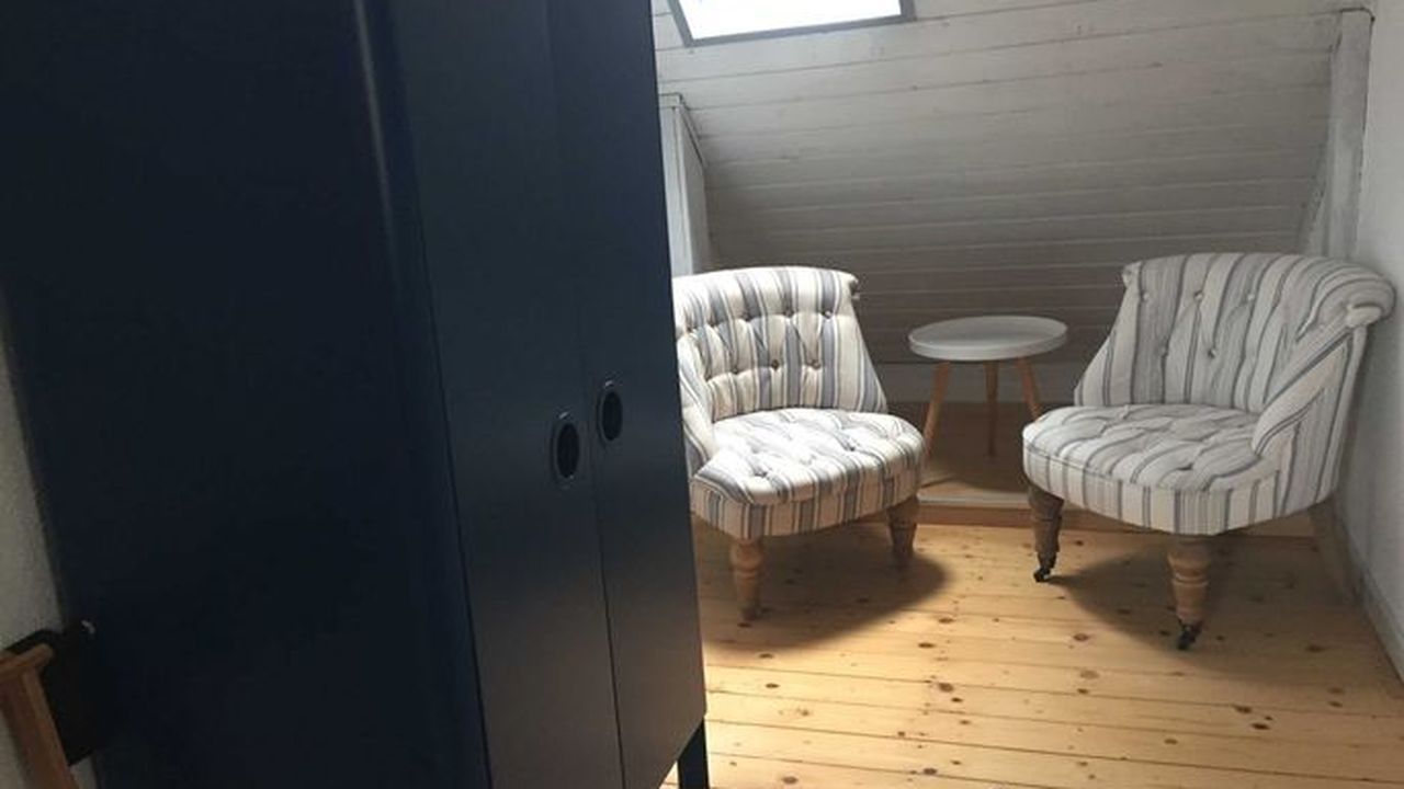 Wohnung (55 qm) im Zwerchgiebel des Stadthausesin der zweiten Etage über den Dächern der Altstadt. Original sanierter Dielenboden, mit (Schlaf)-Couch, Sessel, TV (Kabel), separate Leseecke mit Sessel und Schreibtisch, kostenfreies W-LAN für die Internetnutzung, Stereo-Anlage.