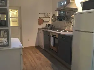 Die Wohnung im Hochparterre (55qm) des Stadthauses bietet einen modernen Loft-Stil und einen großzügigen Wohnbereich mit Eckcouch, (Kabel-)TV, kleine Stereoanlage, freies W-Lan und Schreibplatz. Esstisch mit bequemen Stühlen, Schlafbereich mit Doppelbett (1,40 m, einseitiger Einstieg) ist durch einen Raumteiler getrennt. Die Betten sind bezogen, weitere Decken und Kissen auf Wunsch, Leseecke mit bequemen Sessel.Einbauküche mit Spülmaschine, Herd mit Backofen, Mikrowelle, Wasserkocher, Kaffeemaschine, Toaster,