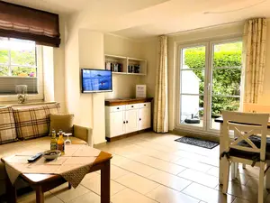 Von der in Hochparterre befindlichen Eingangstüre gehen Sie einige Stufen hinab ins Erdgeschoss, wo sich die Unterkunft Blanker Hans befindet. Die modern und liebevoll eingerichtete Ferienwohnung ist für bis zu drei Personen geeignet und verspricht traumhafte Urlaubstage. Der offene Wohnbereich mit einladender hochwertiger Schlafcouch (150 x 200 cm), Flachbild TV, DVD-Player, WLAN, Telefon und Stereoanlage und integrierter vollausgestatteter Küche mit Backofen, Mikrowelle und Geschirrspüler sowie großzügigem Essbereich ist hell und freundlich. Von hier aus gelangen Sie auf die kleine, gepflegte Terrasse, die ruhig und geschützt liegt. Das Schlafzimmer verfügt über zwei Einzelbetten (80 x200 cm), wo Sie morgens ausgeruht aufwachen können. Das Bad ist hell und verfügt über eine Dusche mit Schiebetür und Handtuchheizung. Insgesamt ist dies ein Domizil mit Wohlfühlcharakter. Egal ob Sie einen ruhigen oder aktiven Urlaub planen, die Wohnung Blanker Hans läßt durch Ihre Lage und die Ausstattung keine Wünsche offen!