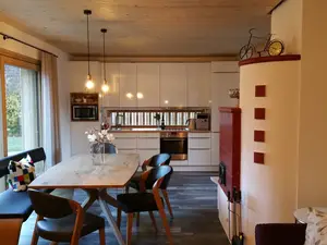 Das neu erbaute großzügige Einzelhaus in Osttirol mit exklusiver Einrichtung und Ausstattung bietet mit ca. 95qm auf 2 Ebenen komfortabel Platz für 2-4 Personen. Genießen Sie auf der Sonnenterrasse laue Sommerabende und den Blick in die Natur und Berge. Urlaub in Lienz bietet alles was das Herz begehrt.Wohnzimmer mit Küche + Kachelofen