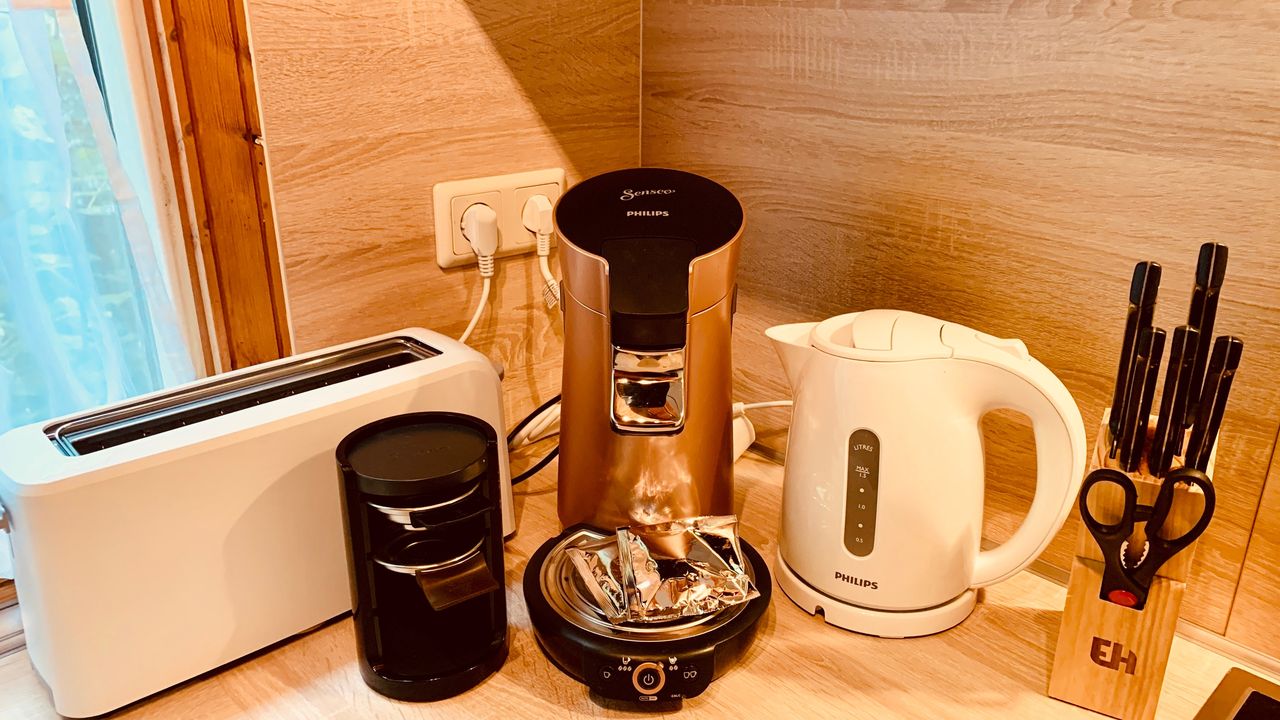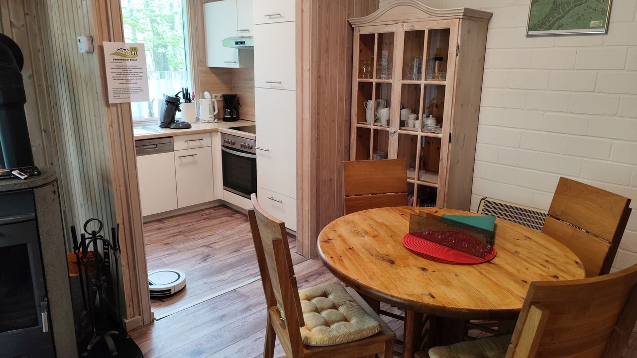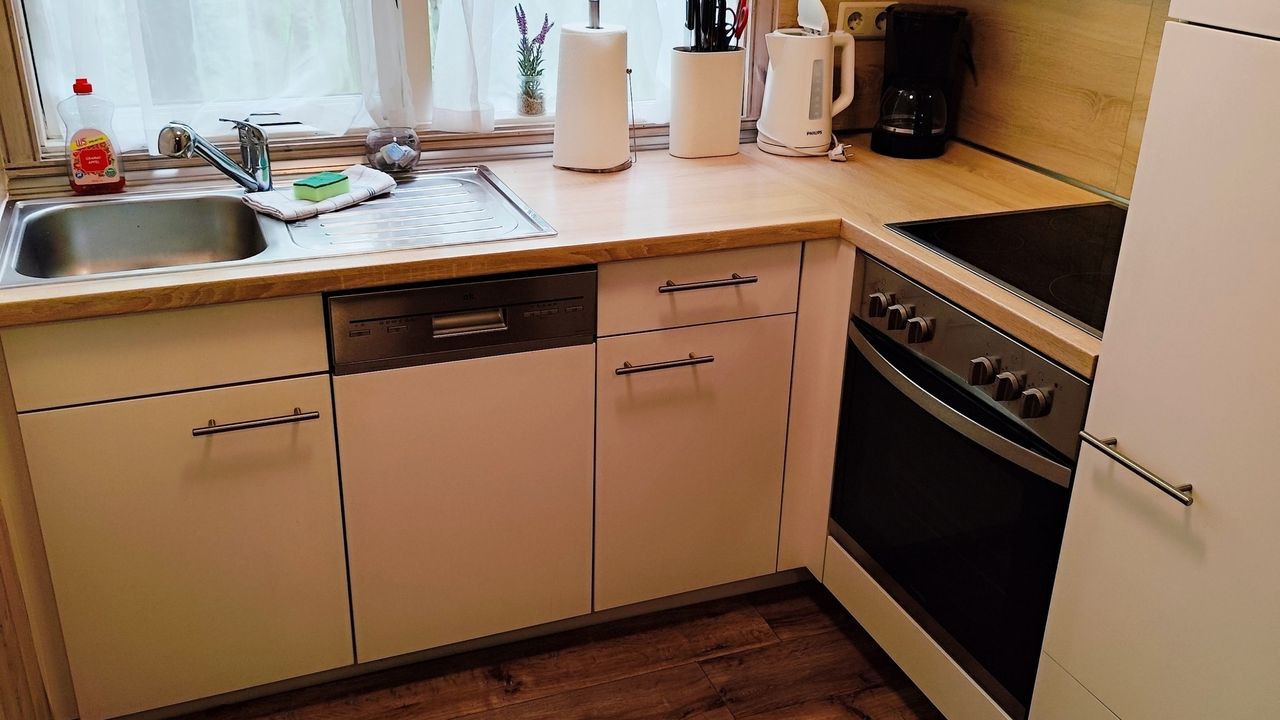 Die zum Wohnraum offene und neue Küche verfügt u.a. über einen Backofen und Ceranfeld, einen Kühlschrank mit Gefrierfach, Mikrowelle, Toaster, Wasserkocher und viele weitere wichtige Utensilien.