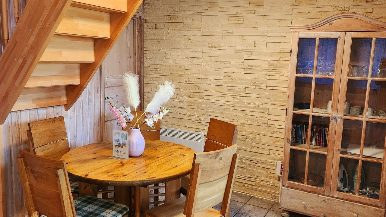 Im Wohnraum befindet sich eine bequeme Sitzlandschaft, ein Essplatz für 5 Personen, sowie ein großer Multimedia Smart-TV und ein Kaminofen.