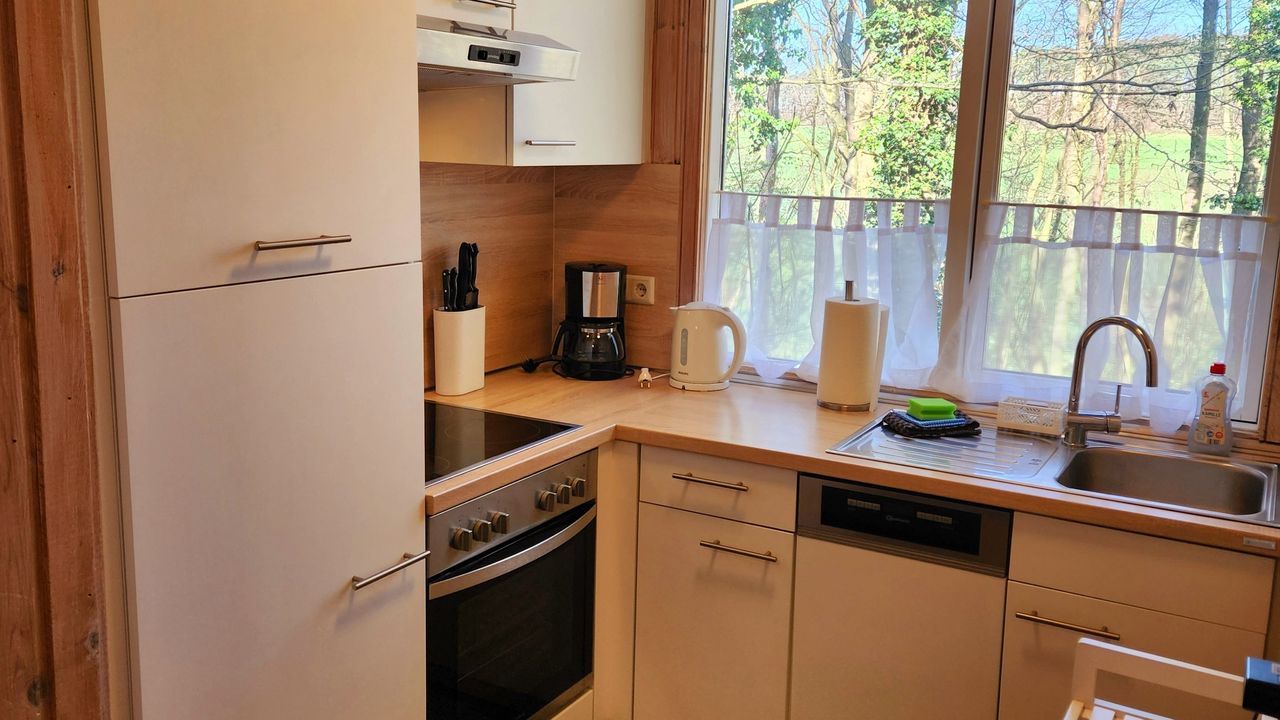 Die zum Wohnraum offene und neue Küche verfügt u.a. über einen Backofen und Ceranfeld, Geschirrspülmaschine, einen Kühlschrank mit Gefrierfach, Mikrowelle, Toaster, Wasserkocher und viele weitere wichtige Utensilien.